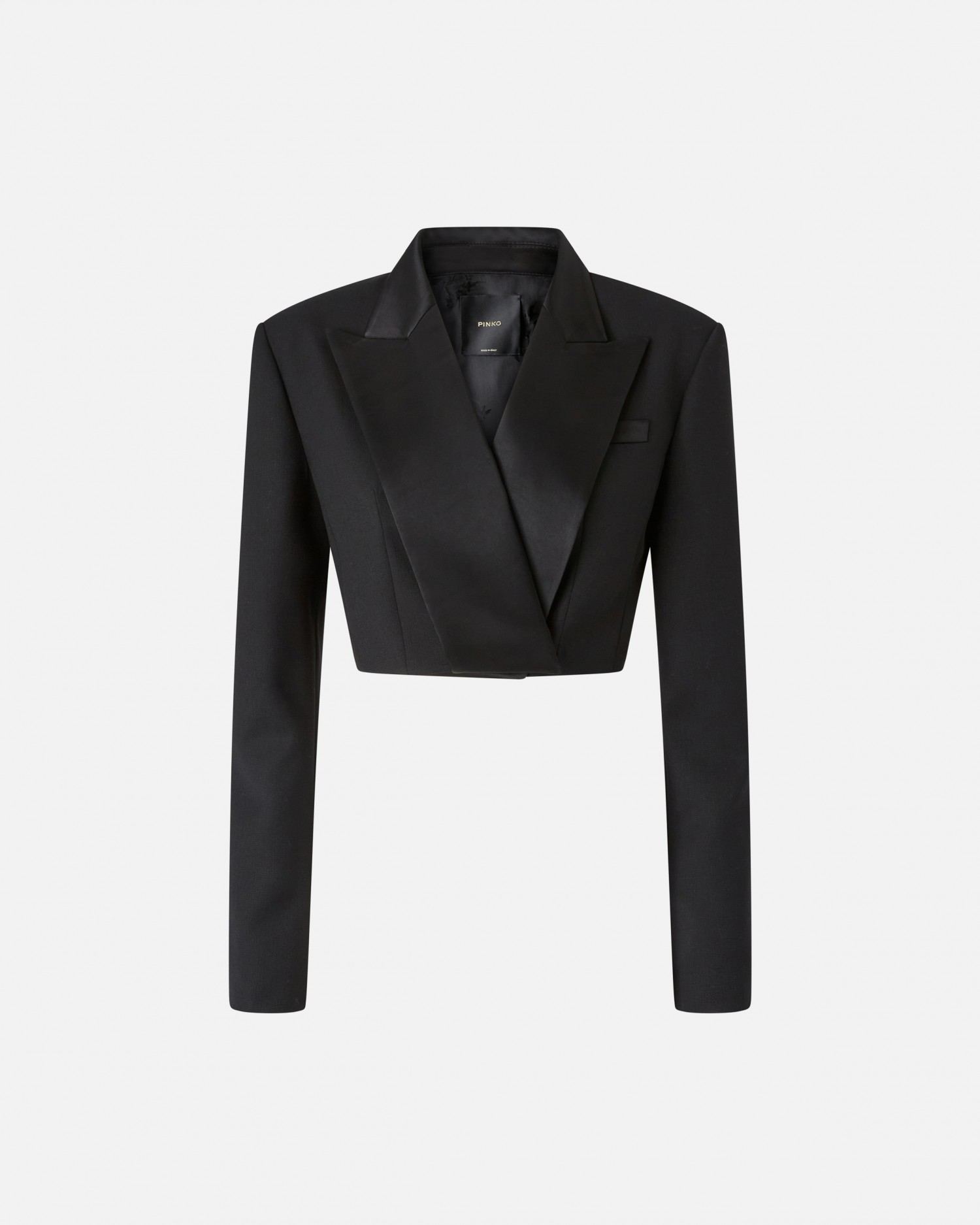Krótka kurtka Spencer z technicznej wełny z kołnierzem z klapami z błyszczącej satyny w tym samym kolorze. Ta mała kurtka ma lekko usztywnione ramiona, długie rękawy i kieszeń na piersi z przodu. Tył jest lekko asymetryczny, nachodzi na siebie i ma niewielkie rozcięcie u dołu. Ta kurtka Spencer to absolutny must-have, idealny do eleganckich, formalnych stylizacji w nowym sezonie.
