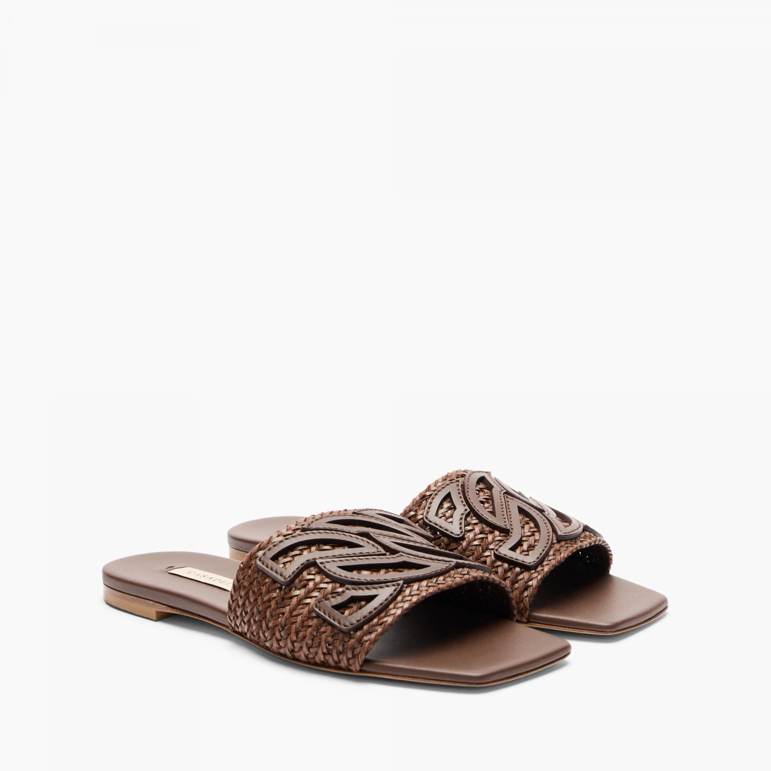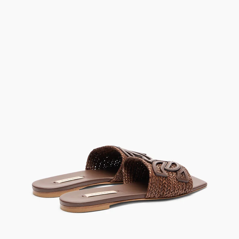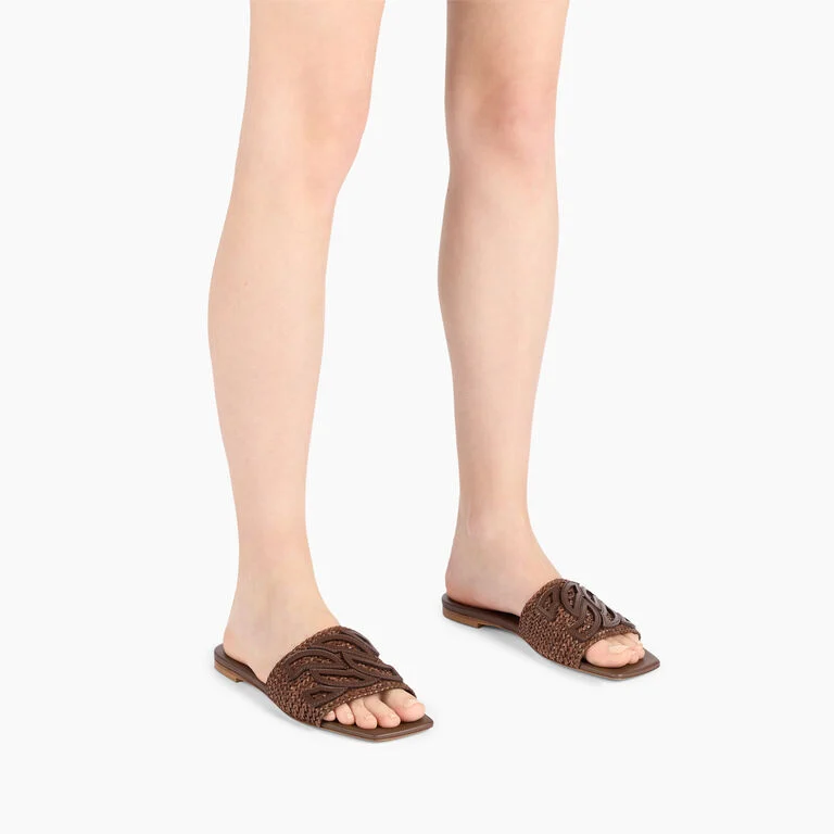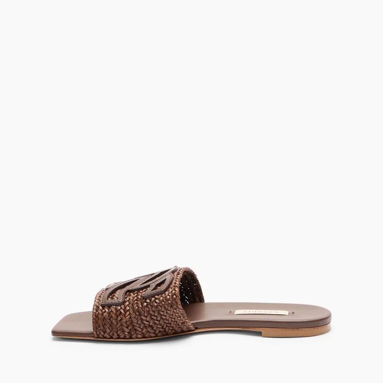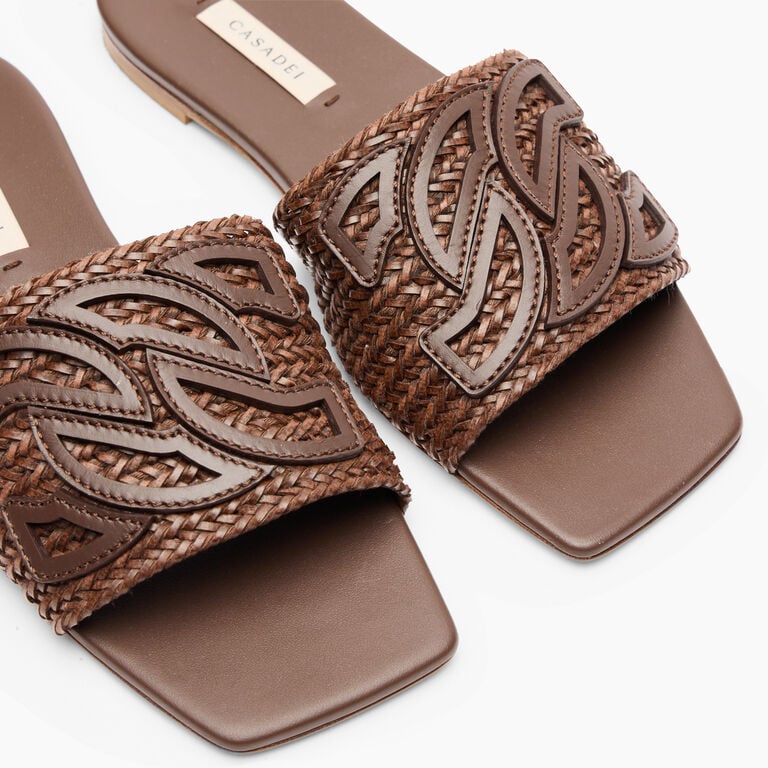 Casadei jest gotowe na letnie wypady, a Ty? Klapki Positano, wykonane z plecionych pasków w wyrafinowanym odcieniu rumu, idealnie nadają się do delektowania się każdą chwilą relaksu. Pasek delikatnie otula stopę, a skórzana podeszwa zapewnia maksymalny komfort. Skórzane logo C-Chain, symbol domu mody, czyni je wyjątkowymi i niepowtarzalnymi.