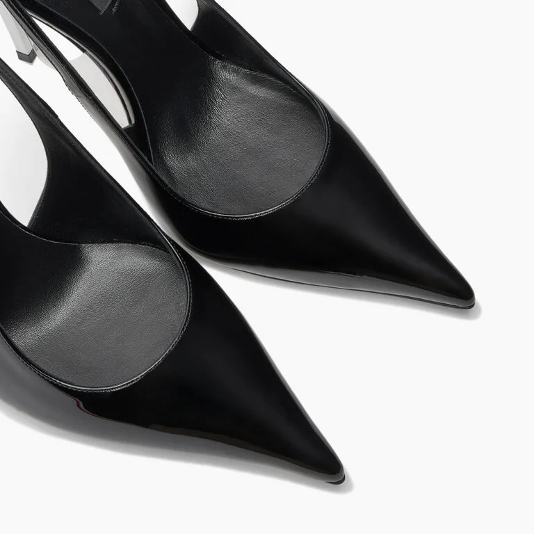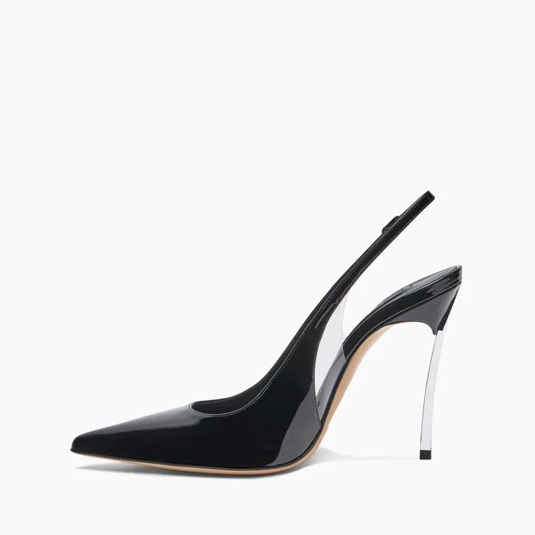 Symbolem elegancji i wyrafinowania są lśniące, czarne, lakierowane sandały Casadei na obcasie typu slingback. Liniowa sylwetka i przezroczyste wstawki z PVC pozwalają na grę głębokich dekoltów i ekstremalnych cięć. Obcas Blade, ikoniczny element domu mody, dodaje stylowi siły i charakteru.