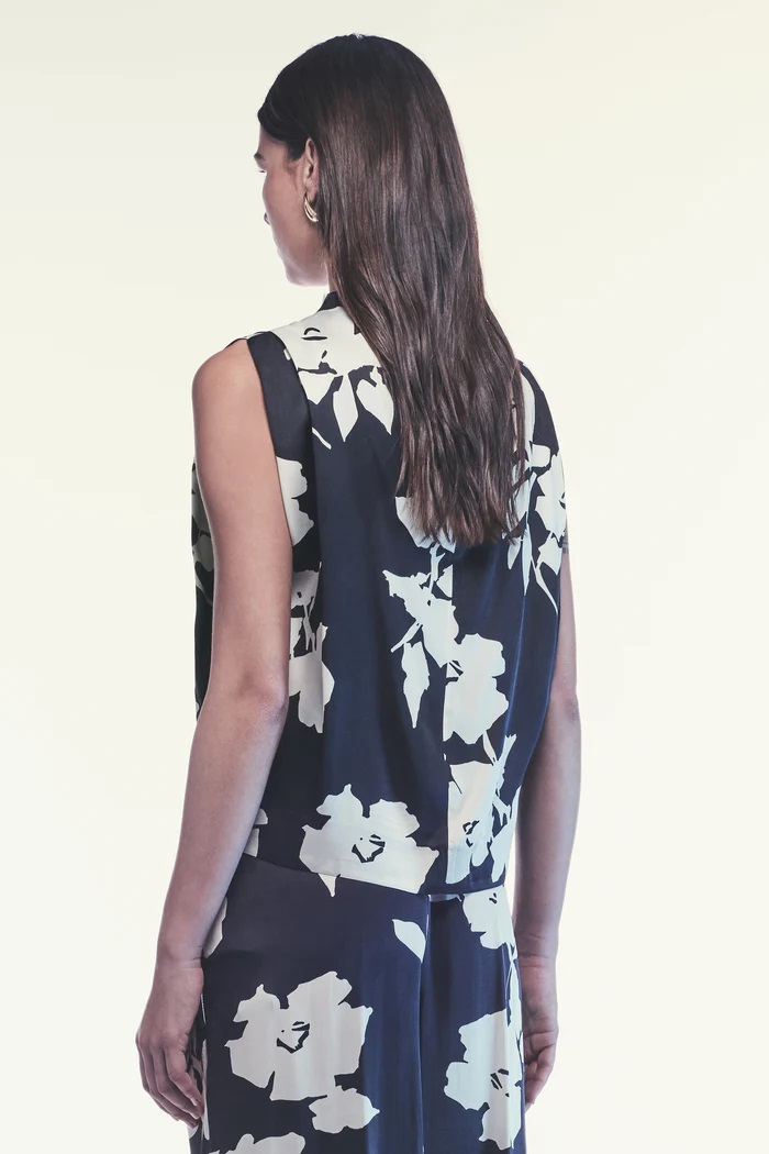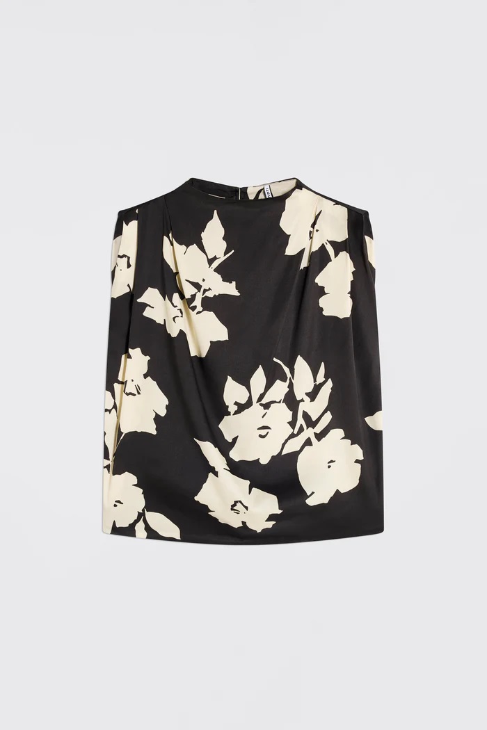 BLUZKA BEZ RĘKAWÓW Z WZORNICZONEJ SATYNY WISKOZOWEJ, Z DEKOLTEM W KSZTAŁCIE KRATERU I ZAPIĘCIEM W KSZTAŁCIE ŁEZKI Z GUZIKIEM Z TYŁU. MIĘKKI STYL I REGULARNY KRÓJ. 100% WISKOZA Wyprodukowano we WŁOSZECH Regularny krój Modelka ma 174 cm wzrostu i nosi rozmiar 42/M (rozmiar włoski)