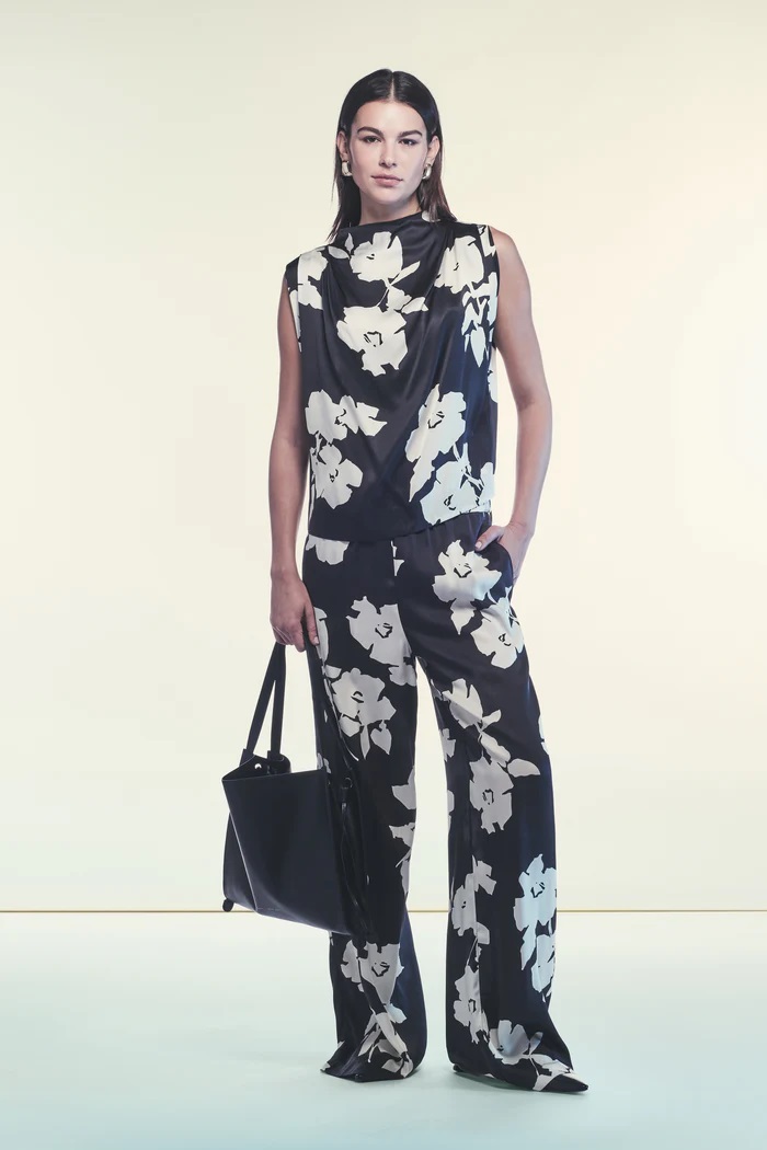 Spodnie Palazzo z nadrukiem z satyny wiskozowej z wysoką gumką w pasie i bocznymi kieszeniami w stylu francuskim. Szeroki krój i wygodne dopasowanie. 100% wiskoza, 67% octan, 33% poliester Wyprodukowano we Włoszech Krój regularny Modelka ma 174 cm wzrostu i nosi rozmiar 42/M (rozmiar włoski)