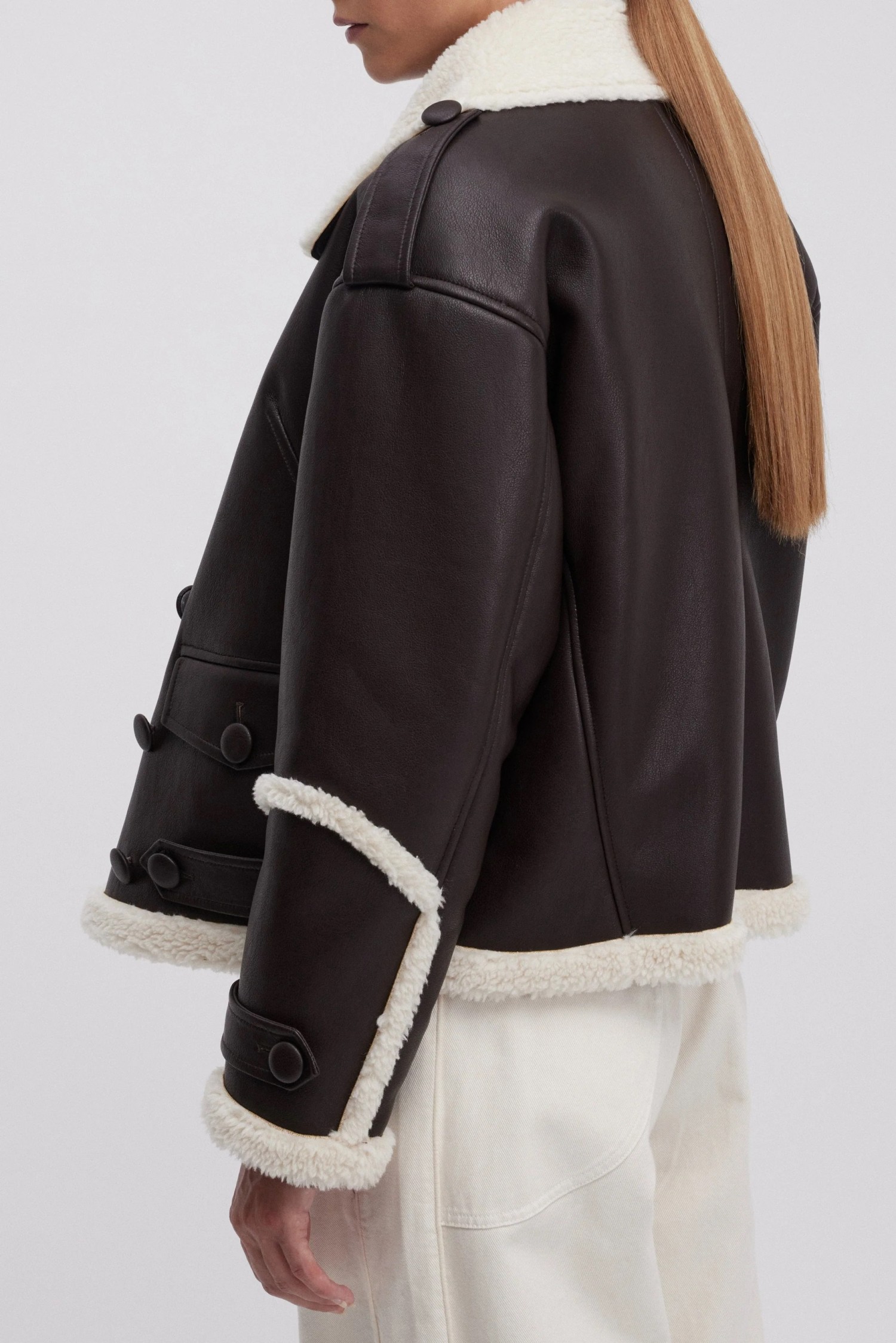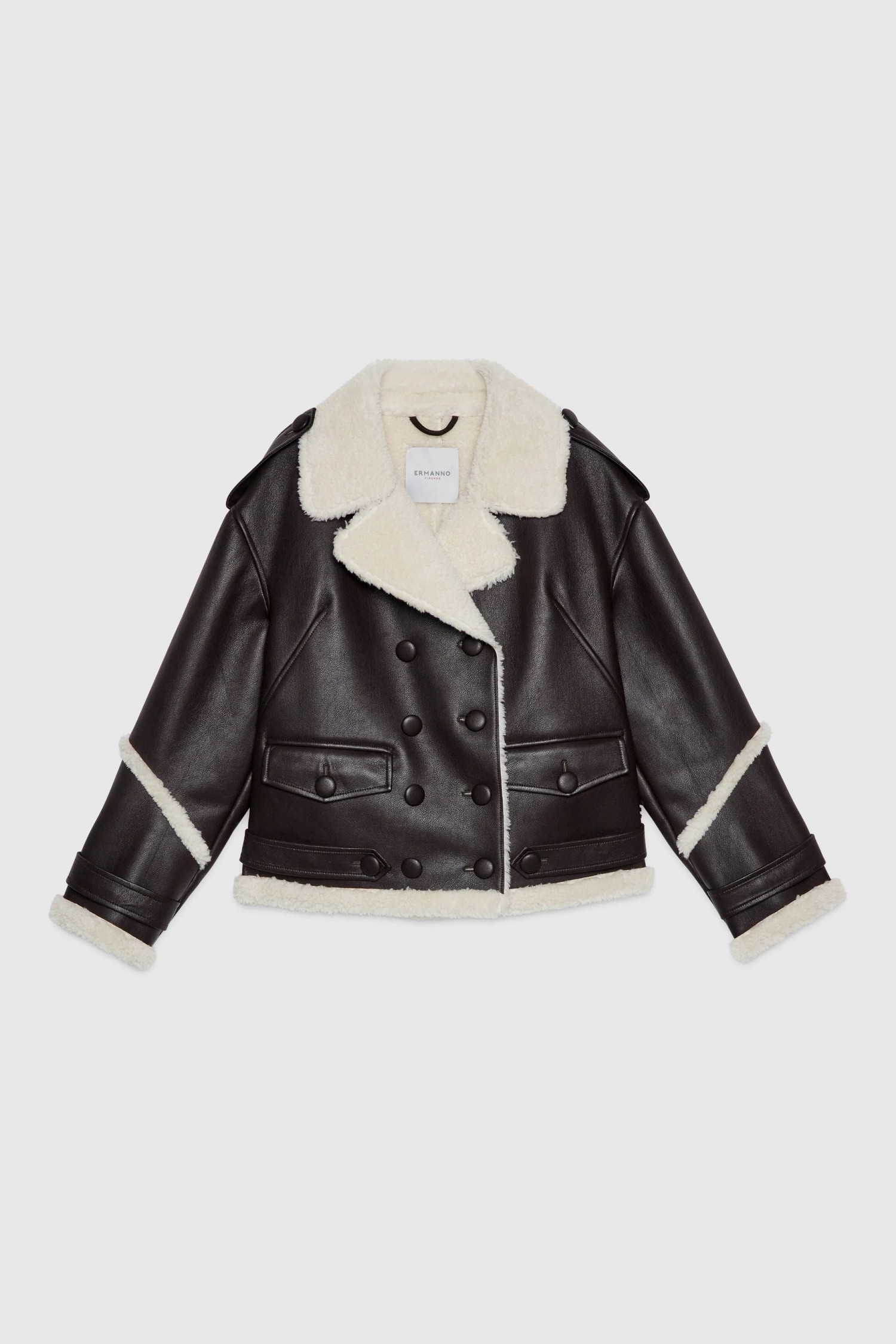 Kurtka z ekologicznego kożucha z wierzchnią warstwą z brązowej sztucznej skóry, szerokim dekoltem z klapami, miękkim, kremowym futerkiem i wnętrzem. Zapięcie dwurzędowe na obciągane guziki i zapięcie na guziki na ramieniu.