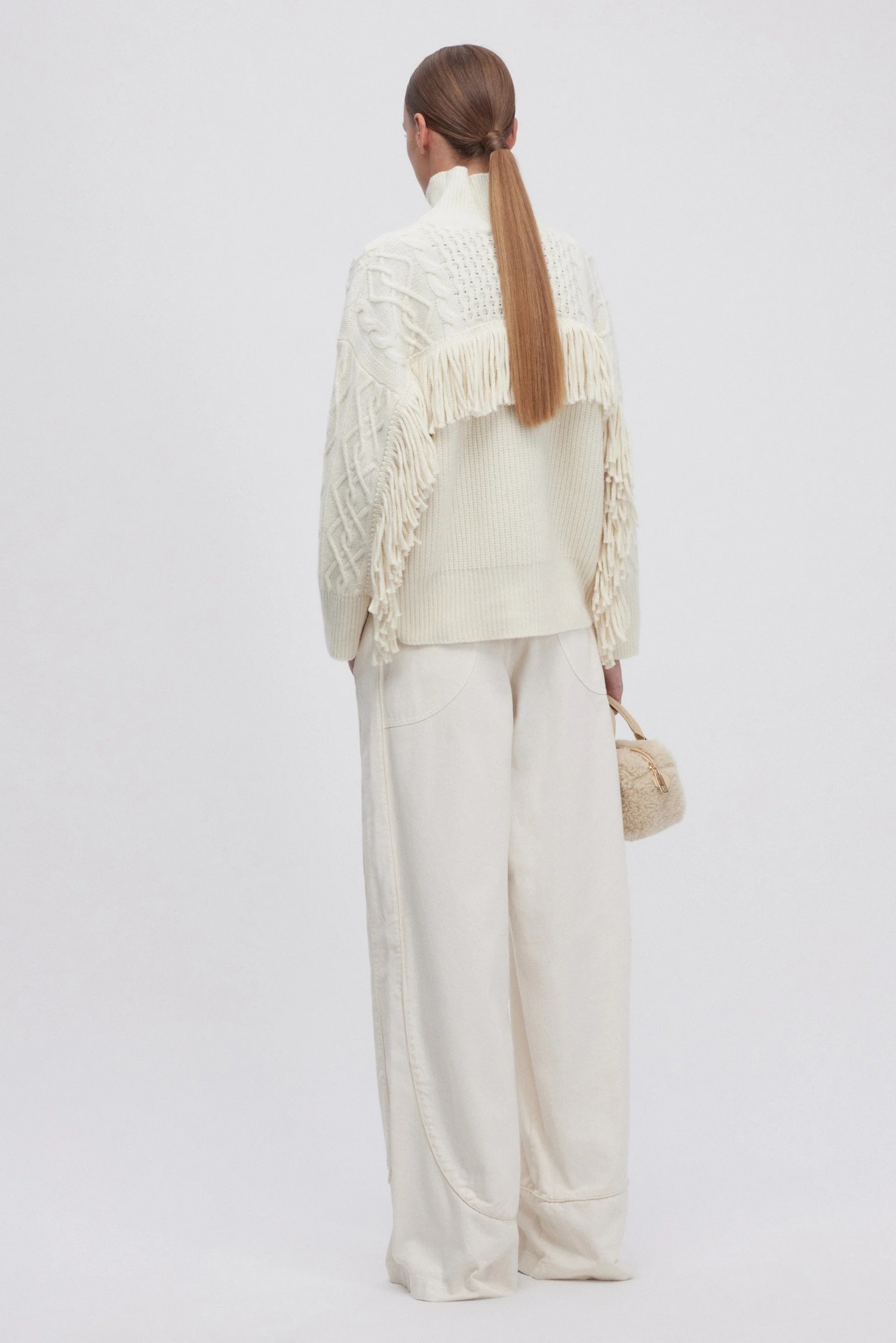 Spodnie bawełniane z efektem barwienia, szerokie nogawki z bocznymi lamówkami w tym samym kolorze. Kieszenie boczne, luźny krój i niski stan.