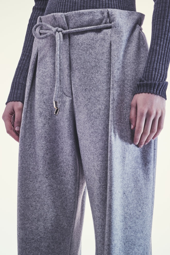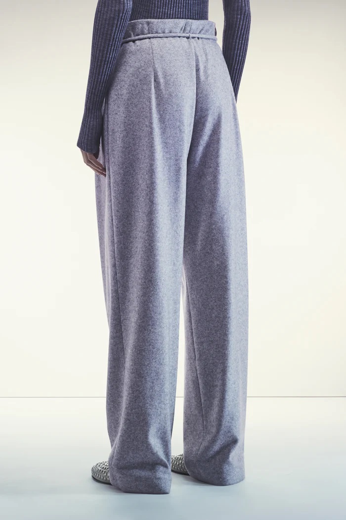 Spodnie z szerokimi nogawkami z jasnoszarego kaszmiru. Wysoki stan z regulowanym sznurkiem, zakładkami z przodu i wszytymi kieszeniami bocznymi. Szerokie nogawki, długość do kostek.