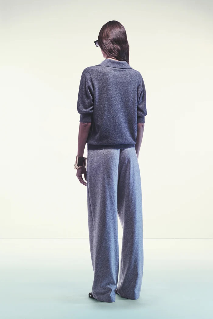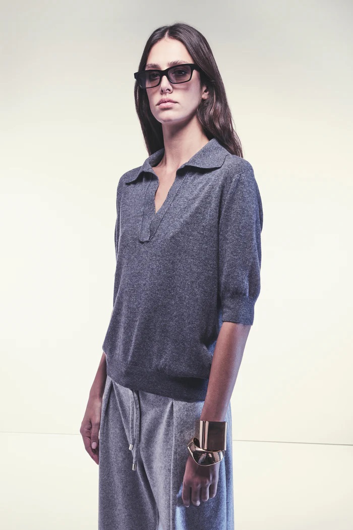 DZIANINA Z RĘKAWAMI TRZY CZWARTE Z RECYKLINGOWANEGO KASZMIRU, KOŁNIERZYKIEM W STYLU KOSZULI I DEKOLTEM W SEREK BEZ GUZIKÓW. DŁUGOŚĆ DO BIODR, MIĘKKA I LEKKA LINIA.