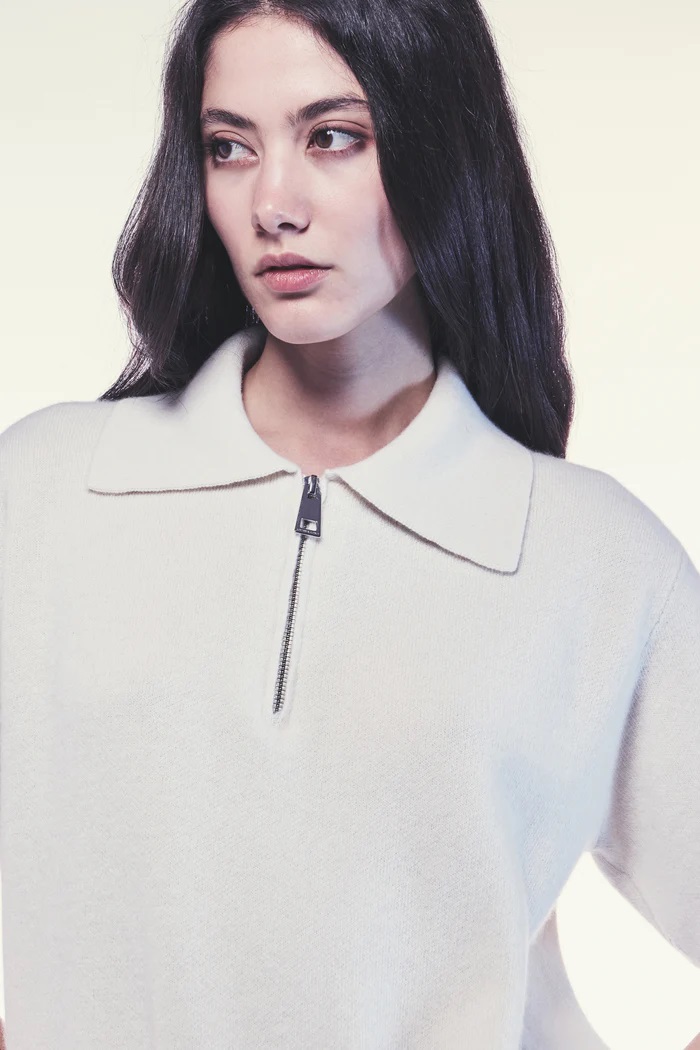 DZIANINA Z KRÓTKIM RĘKAWEM Z RECYKLINGOWANEGO KASZMIRU, KOŁNIERZYKIEM W STYLU KOSZULI I DEKOLTEM W SEREK Z REGULOWANYM ZAMKIEM. ELASTYCZNY DÓŁ, LINIJNY STYL.