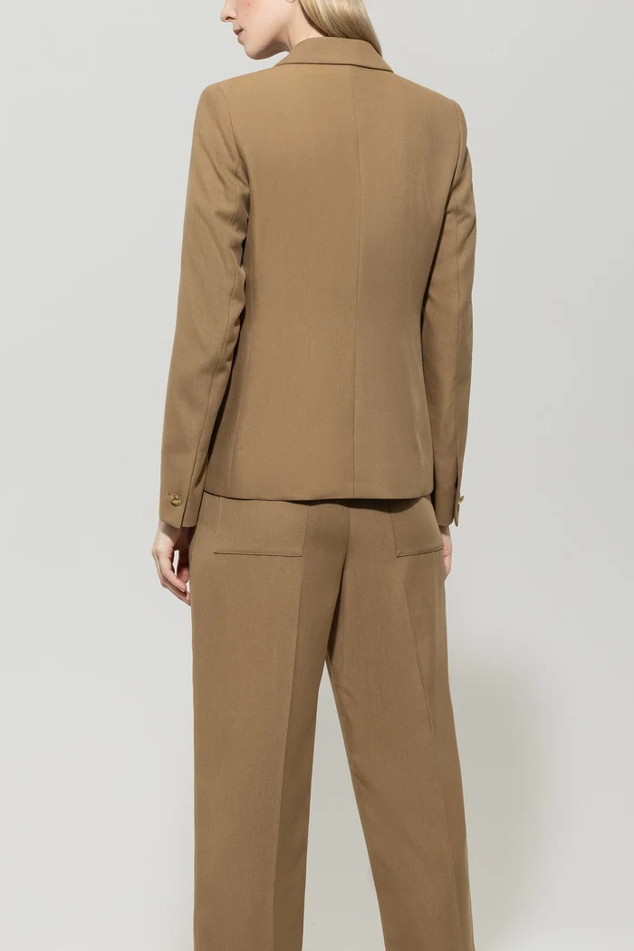Zwężane spodnie wykonane z lejącego się gabardynowego materiału o diagonalnej fakturze. Szczególną atrakcją jest odpinany pasek z metalową klamrą.