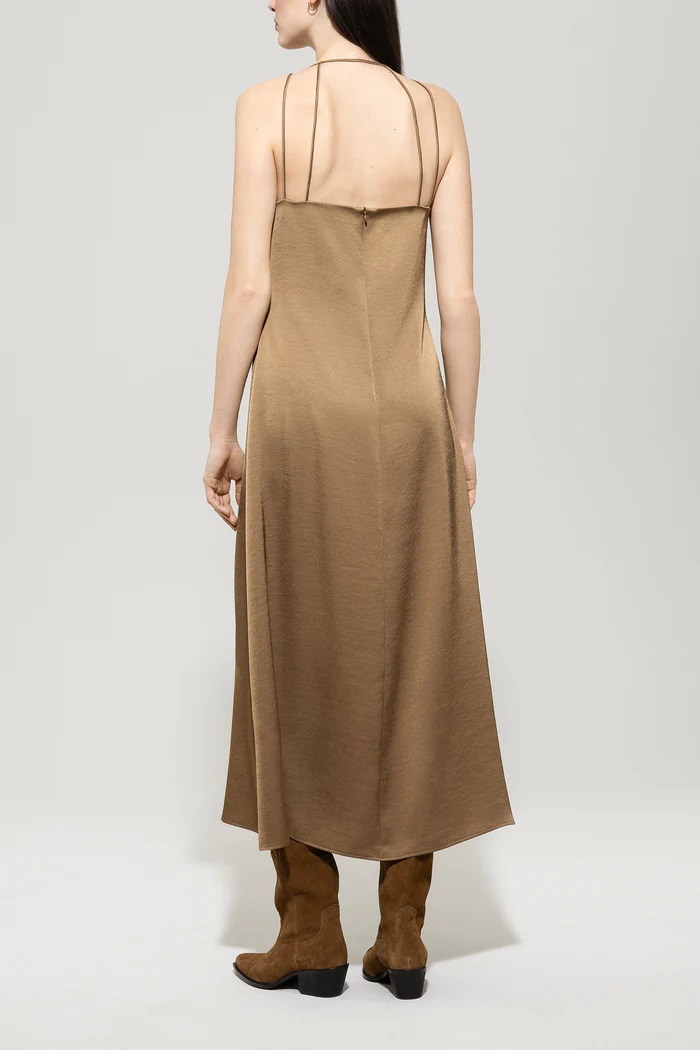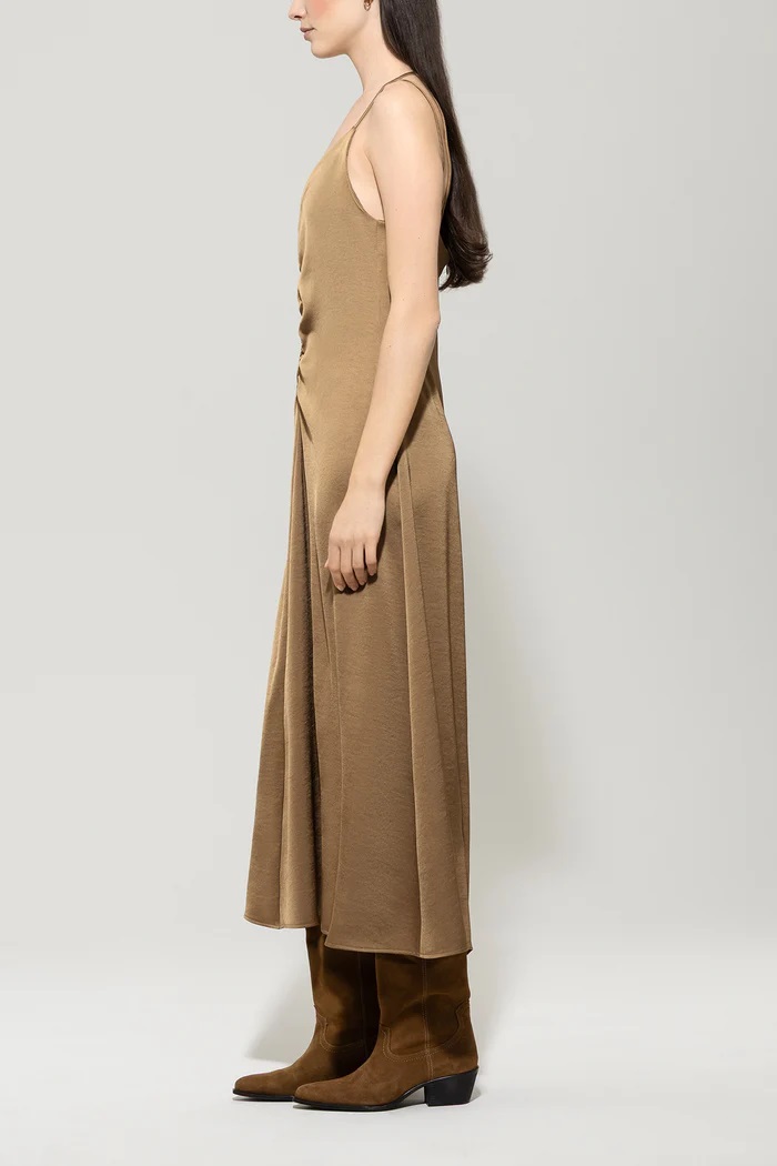 Satynowa sukienka bez rękawów z wyrafinowanym paskiem i kobiecymi marszczeniami poniżej dekoltu w kształcie litery V. Długa, lejąca spódnica elegancko kołysze się przy każdym ruchu.