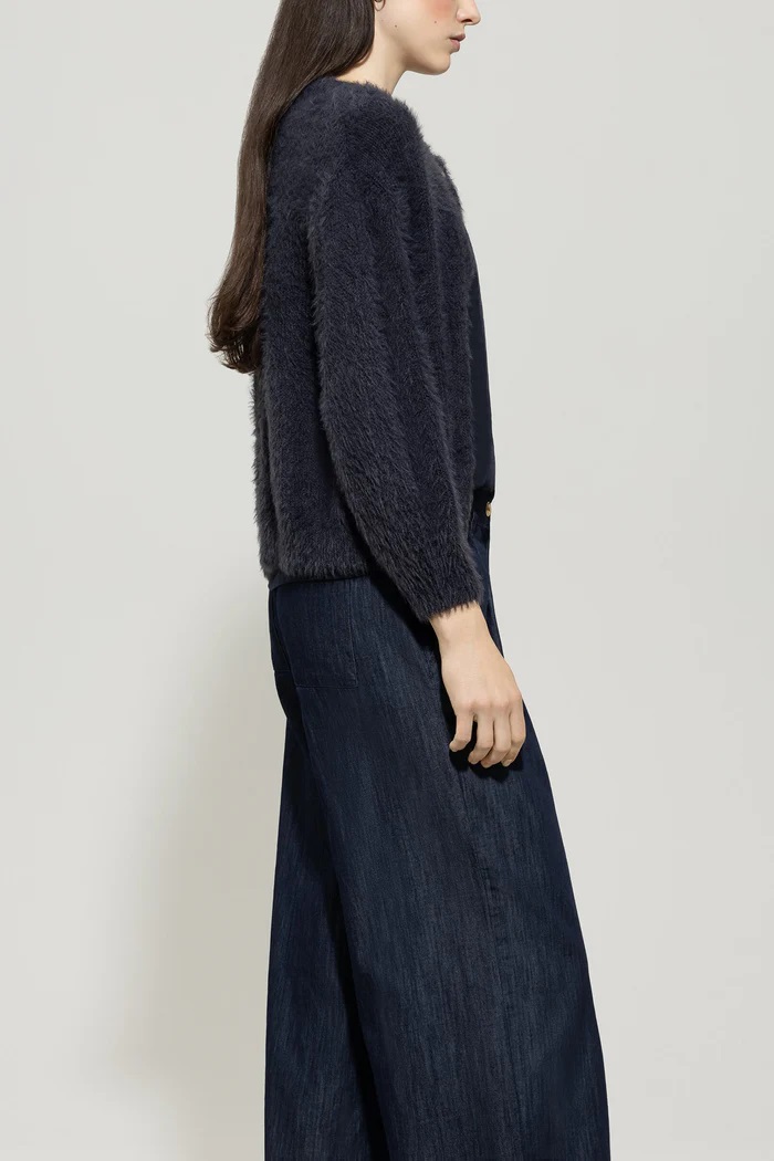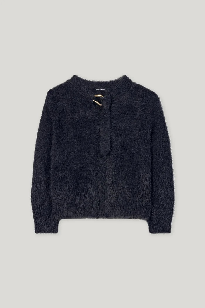 Otwarty kardigan o lekko przyciętej sylwetce wykonany z miękkiej dzianiny o wyglądzie sztucznego futra. Wiązana tasiemka z ozdobną metalową klamrą przy dekolcie dodaje kardiganowi tego czegoś.