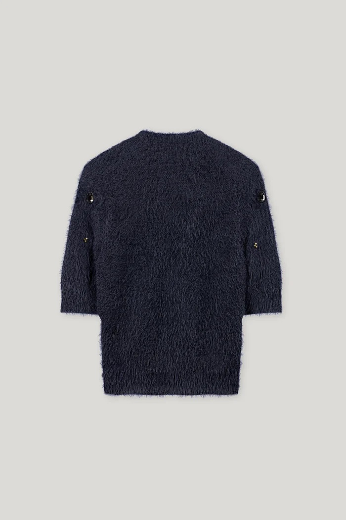 Dzianinowy sweter z krótkim rękawem, wykonany z mieszanki bawełny o wyglądzie puszystego sztucznego futra. Sweter jest ręcznie haftowany błyszczącymi kamieniami szlachetnymi i koralikami.