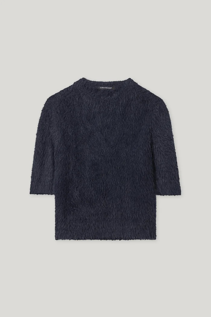 Jednokolorowy sweter z dzianiny z okrągłym dekoltem i średniej długości rękawami. Miękka przędza o wyglądzie sztucznego futra gwarantuje przytulne uczucie.