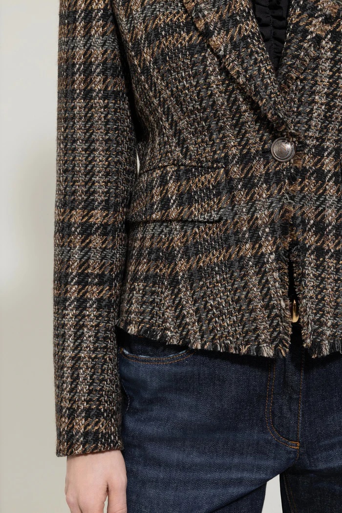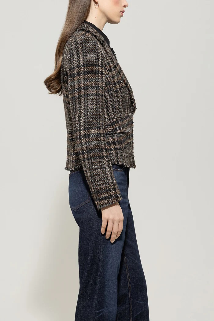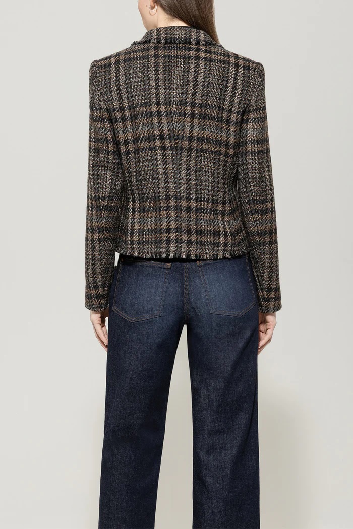 Krótka, dopasowana marynarka zapinana na jeden guzik z miękkiej mieszanki wełny z wzorem w kratkę i wstawkami na ramionach. Marynarka z podszewką ma otwarte wykończenie i dwie naszywane kieszenie z patkami.
