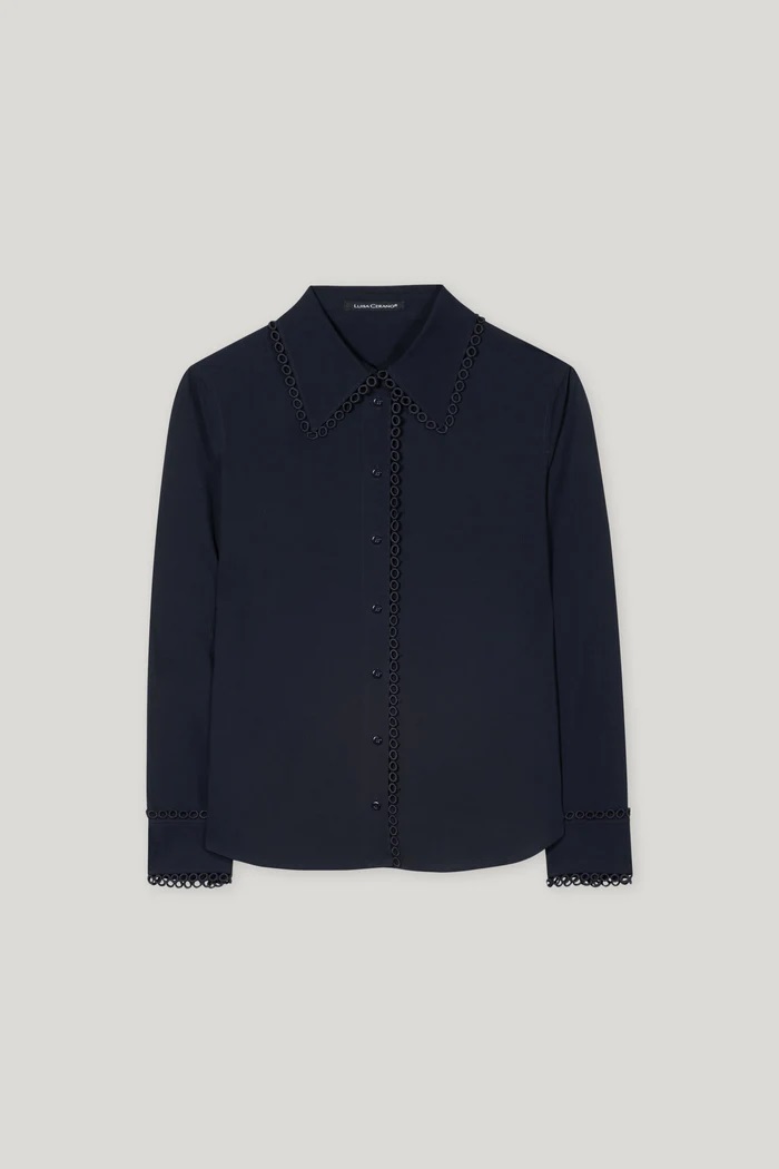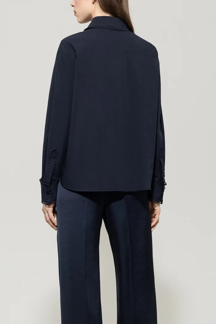 Bluzka koszulowa wykonana z delikatnego bawełnianego woalu o swobodnym kroju. Bluzka jest ozdobiona minimalistyczną koronkową lamówką na kołnierzyku, plisie guzikowej i mankietach rękawów.
