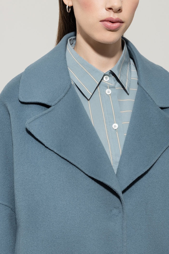 Ciepła peleryna wykonana z luksusowej mieszanki wełny i kaszmiru w podwójnym fasonie. Kurtka ma ukryte zapięcie na zatrzaski i boczne kieszenie.