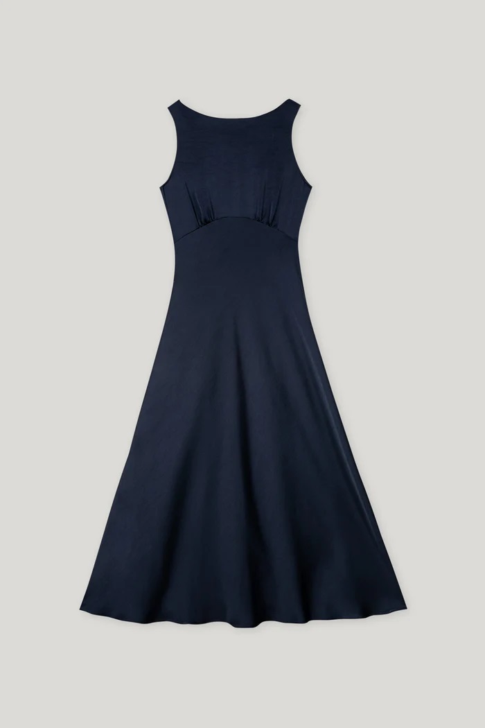Sukienka maxi bez rękawów z lejącej satyny z wycięciem na plecach. Rozkloszowana spódnica podkreśla elegancką sylwetkę.