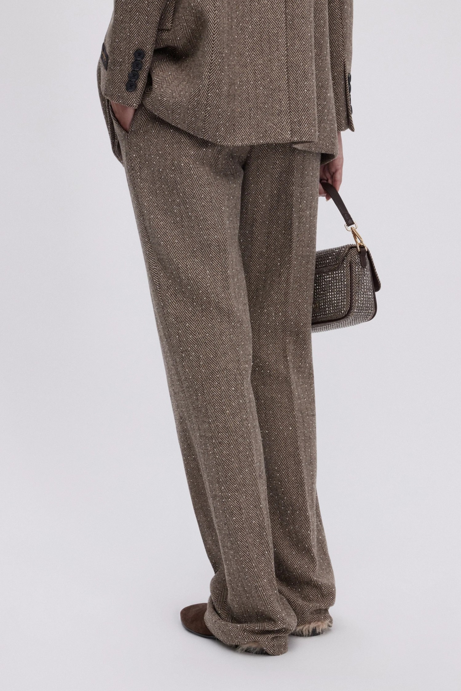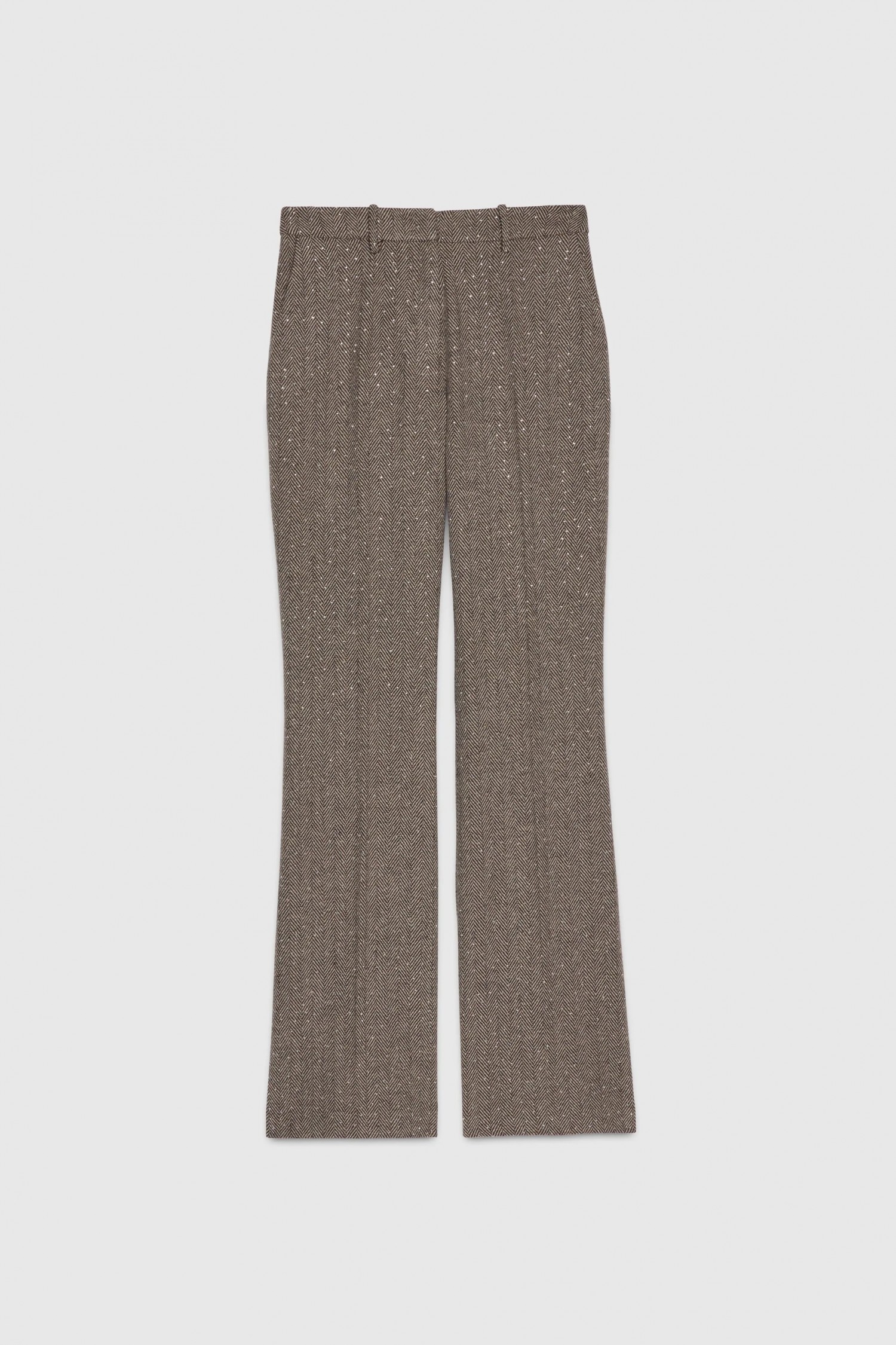 Spodnie w jodełkę, dopasowane i o prostym kroju, w kolorze złamanej bieli i brązu, ozdobione aplikacją srebrnych mikrokryształów zapewniających wyrafinowany i elegancki wygląd.