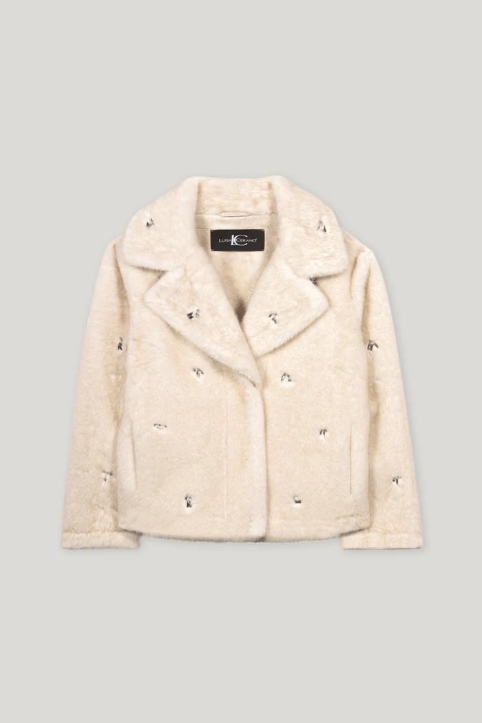Luksusowa kurtka wykonana ze sztucznego futra o wyglądzie lisa z dużym kołnierzem klapowym, ukrytym zapięciem na zatrzaski i dwiema rozciętymi kieszeniami. Wbudowane błyszczące kamienie dodają wyrafinowanych akcentów.
