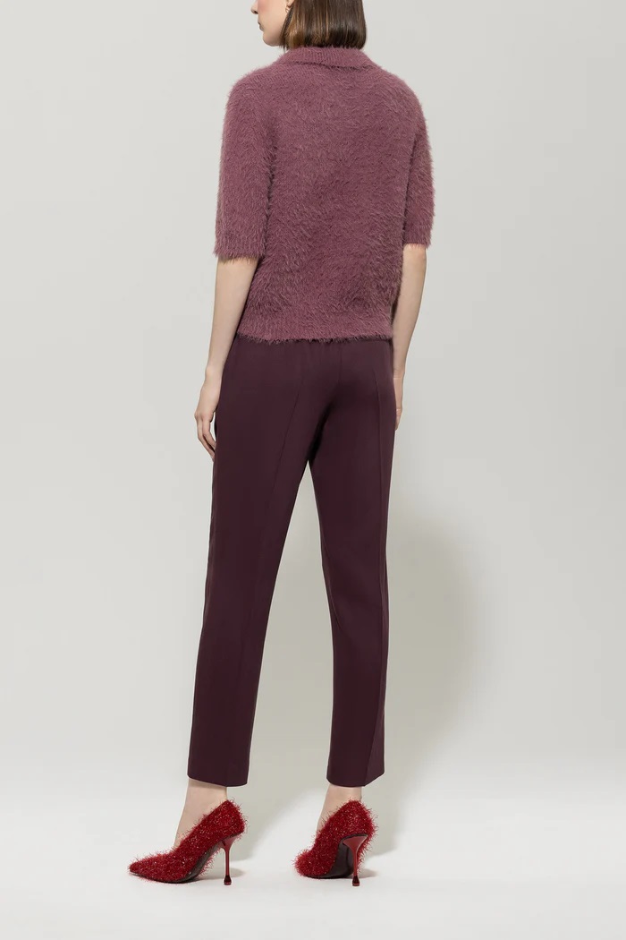 Przycięte spodnie o sportowym, zwężanym kroju wykonane z wysokiej jakości gabardyny. Spodnie mają zakładki, boczne rozcięte kieszenie i wskazaną tylną kieszeń.