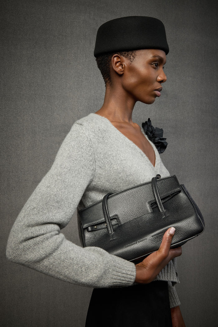 SZARY KARDIGAN Z KASZMIRU I JEDWABIU Z DEKOLTEM W SEREK I ZAPIĘCIEM NA GUZIKI Z PRZODU. CZARNY DETAL KWIATOWY NASZYTY RĘCZNIE NA LEWYM RAMIENIU.