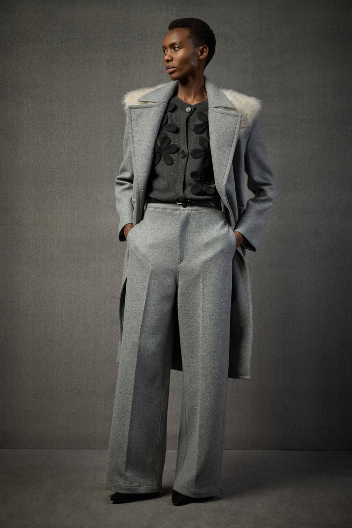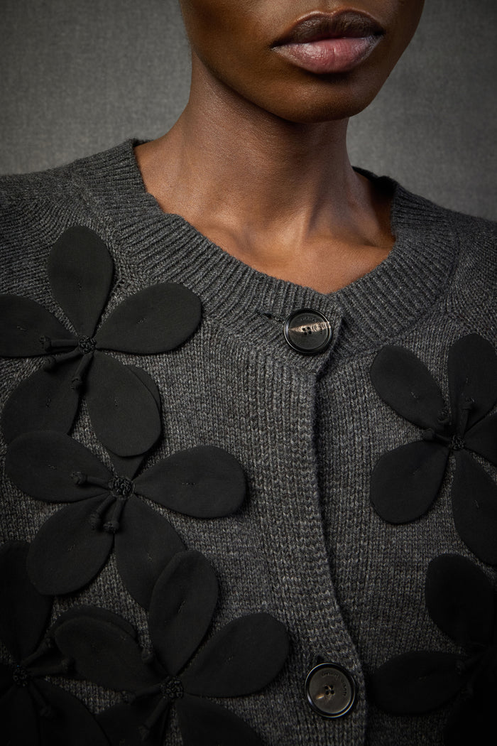 DZIANINA Z KRÓTKIM RĘKAWEM Z RĘCZNIE HAFTOWANEGO KASZMIRU Z RECYKLINGU, Z DUŻYMI CZARNYMI KWIATAMI NASZYTYMI Z PRZODU I ZAPIĘCIEM NA GUZIK NA ŚRODKU.