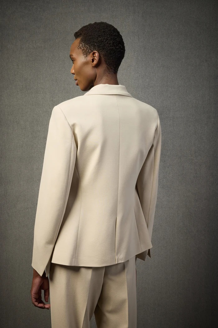 JEDNORZĘDOWA MARYNARKA WYKONANA ŚCIEGIEM MEDIOLANSKIM, O DOPASOWANYM KROJU, Z KOŁNIERZEM Z KLAPY, ZAPIĘCIEM NA POJEDYNCZY GUZIK I KIESZENIAMI SKOŚNYMI Z PAPKĄ. ROZCIĘCIE Z TYŁU NA ŚRODKU. DŁUGOŚĆ DO BIODR.