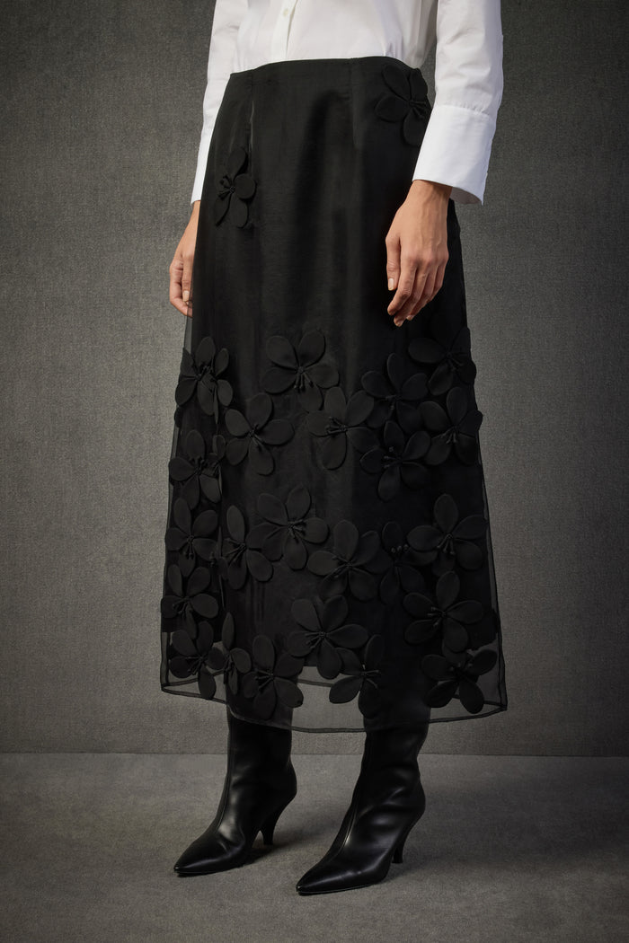 DŁUGA SPÓDNICZKA Z RĘCZNIE HAFTOWANEJ JEDWABIU Z ORGANZY Z KWIATOWYMI APLIKACJAMI I PRZEŹROCZYSTYM DÓŁ. 100% JEDWAB, 100% POLIESTER, 100% WISKOZA