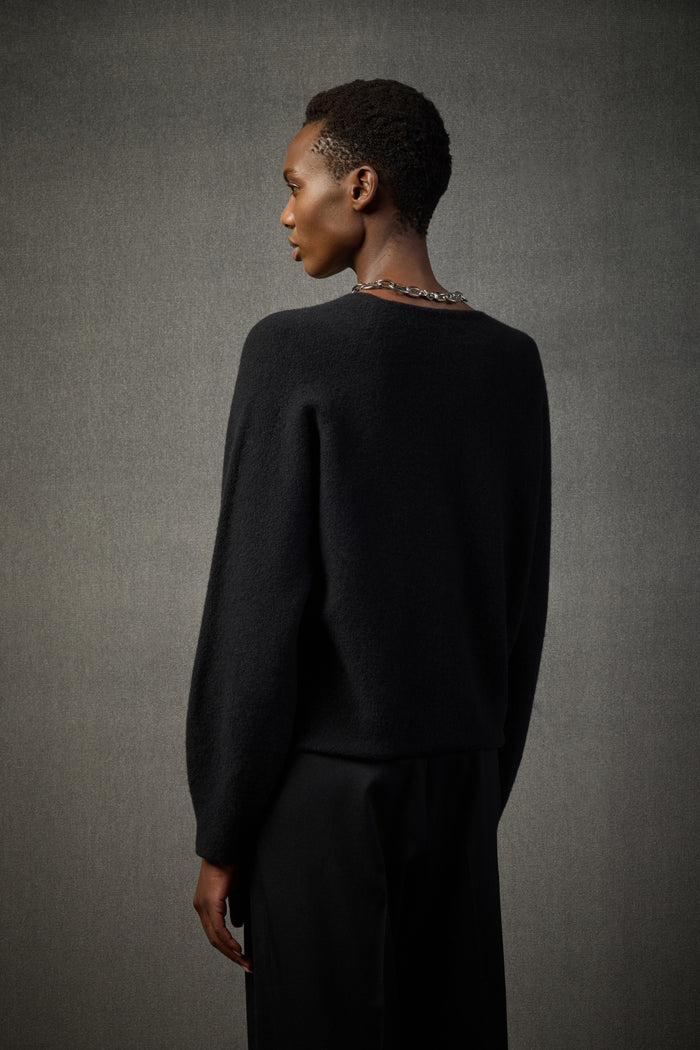 CZARNY KARDIGAN Z WEŁNY I KASZMIRU. DEKOLT W SZPIKU I ZAPIĘCIE Z TRÓJWYMIAROWYM DETALEM Z RÓŻĄ, ZAKRYWAJĄCYM GUZIKI Z PRZODU.