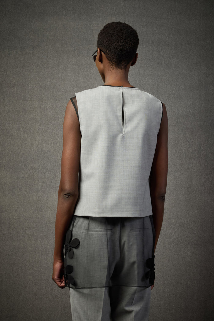 BLUZKA BEZ RĘKAWÓW Z CHŁODNEJ WEŁNY Z ROZCIĘCIEM Z TYŁU, HAFTOWANY DETAL Z JEDWABIU Z ORGANZY U DOŁU. CZARNY JEDWABNY SPÓD Z ORGANZY SPRZEDAWANY JEST OSOBNO. 53% POLIESTER, 43% POLAR, WEŁNA, 4% ELASTAN, 100% JEDWAB, 100% POLIESTER Krój regularny Modelka ma 174 cm wzrostu i nosi rozmiar 42/M (rozmiar włoski)