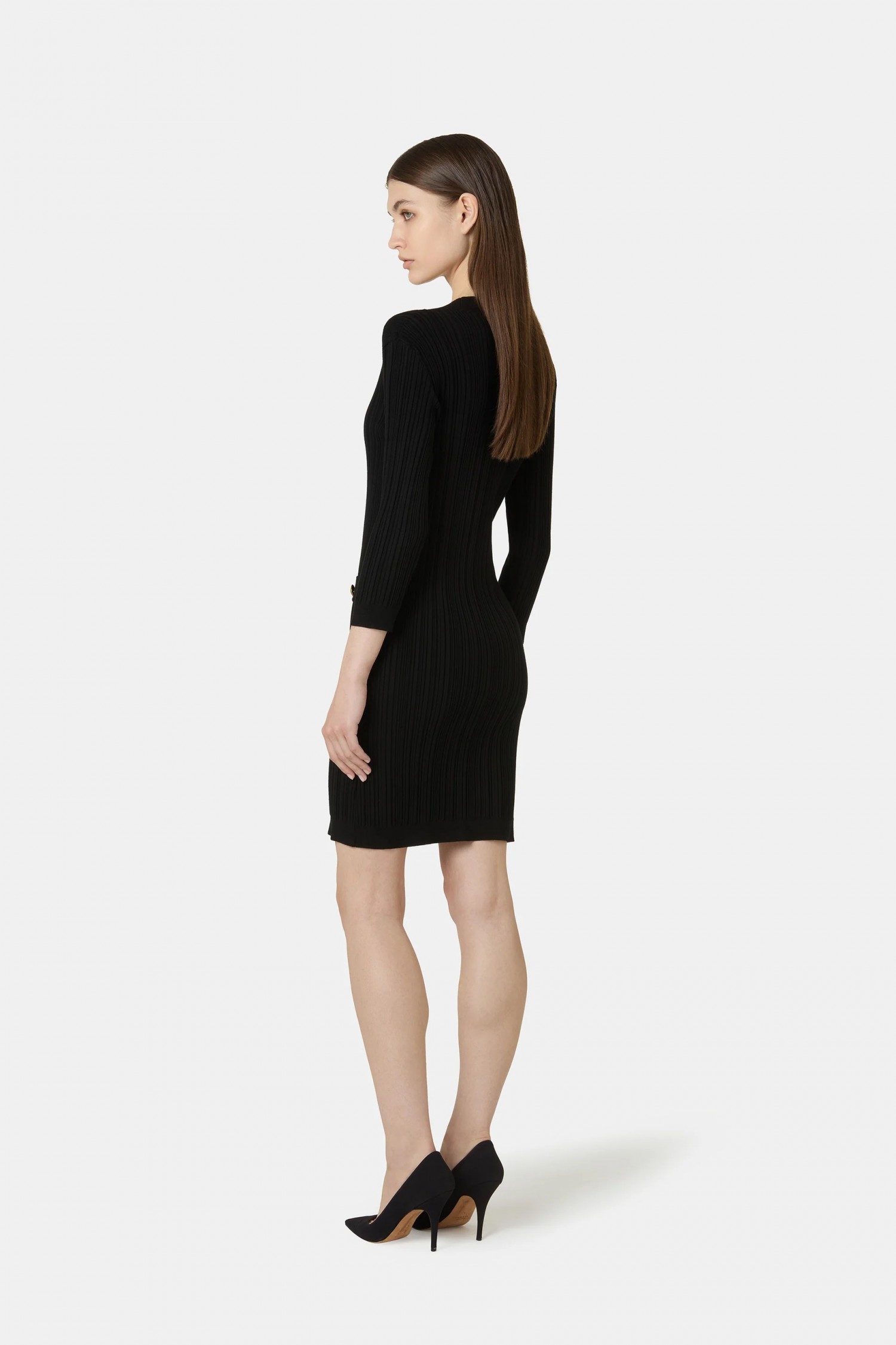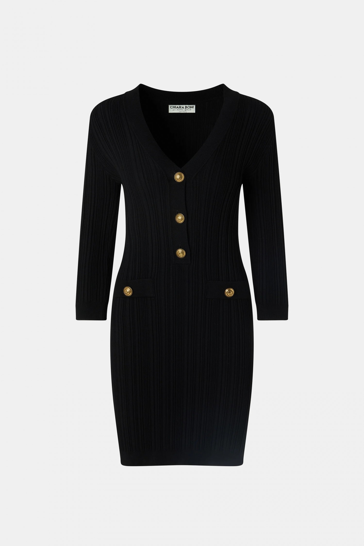 Dzianinowa sukienka Nuj to nowy dodatek do kolekcji, idealny na każdą elegancką okazję. Dekolt w serek i złote, markowe guziki dodają jej szykownego charakteru, a smukły krój podkreśla figurę.