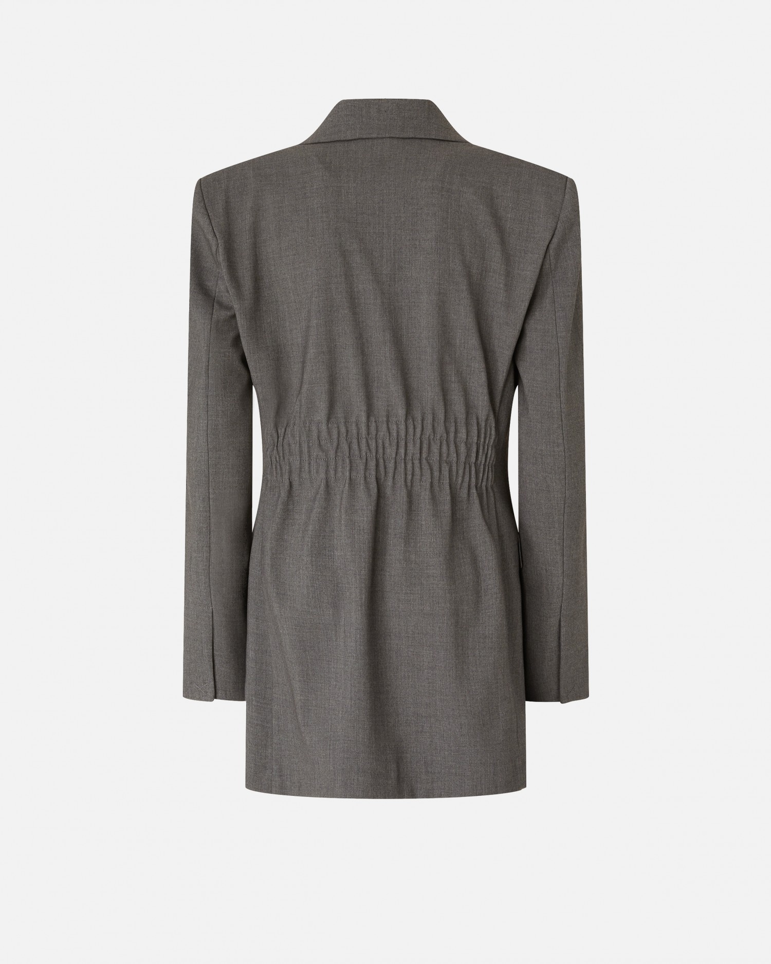 Jednorzędowy żakiet o dopasowanym fasonie, uszyty z klasycznego, melanżowego płótna w połączeniu z techniczną dzianiną. Doskonały przykład nowej interpretacji klasycznego i formalnego projektu. Prezentowany model ma innowacyjne i bardziej sportowe detale, takie jak marszczenie z tyłu na wysokości talii, dodatkowo podszewka zapewnia wygodne noszenie. Jeśli szukasz modelu, która dopełni twoje codzienne stylizacje wyrafinowanym akcentem, możesz przestać szukać!