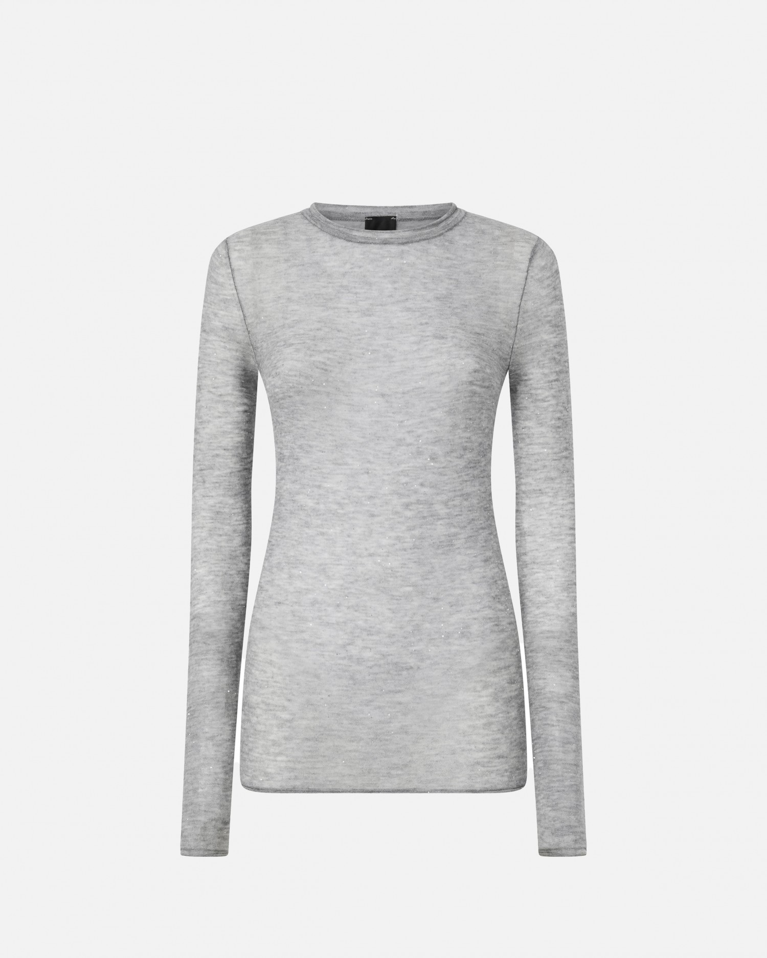 Sweter z okrągłym dekoltem wykonany z półprzezroczystej mieszanki wełny z lekkiej i miękkiej przędzy, prawie niewyczuwalnej, która pomaga stworzyć zmysłowy i efektowny wygląd. Model jest ozdobiony drobnymi ułożonymi w rzędzie cekinami, dzięki czemu będąc minimalistycznym i bardzo wygodnym w noszeniu, jest jednocześnie lśniący i wystawny. Odzież została poddana testom wykończeniowym, aby zminimalizować możliwość tworzenia się mechaceń i zapewnić większą miękkość i trwałość materiału. Ostatnim akcentem jest umieszczona z tyłu etykietka z napisem z logo PINKO.