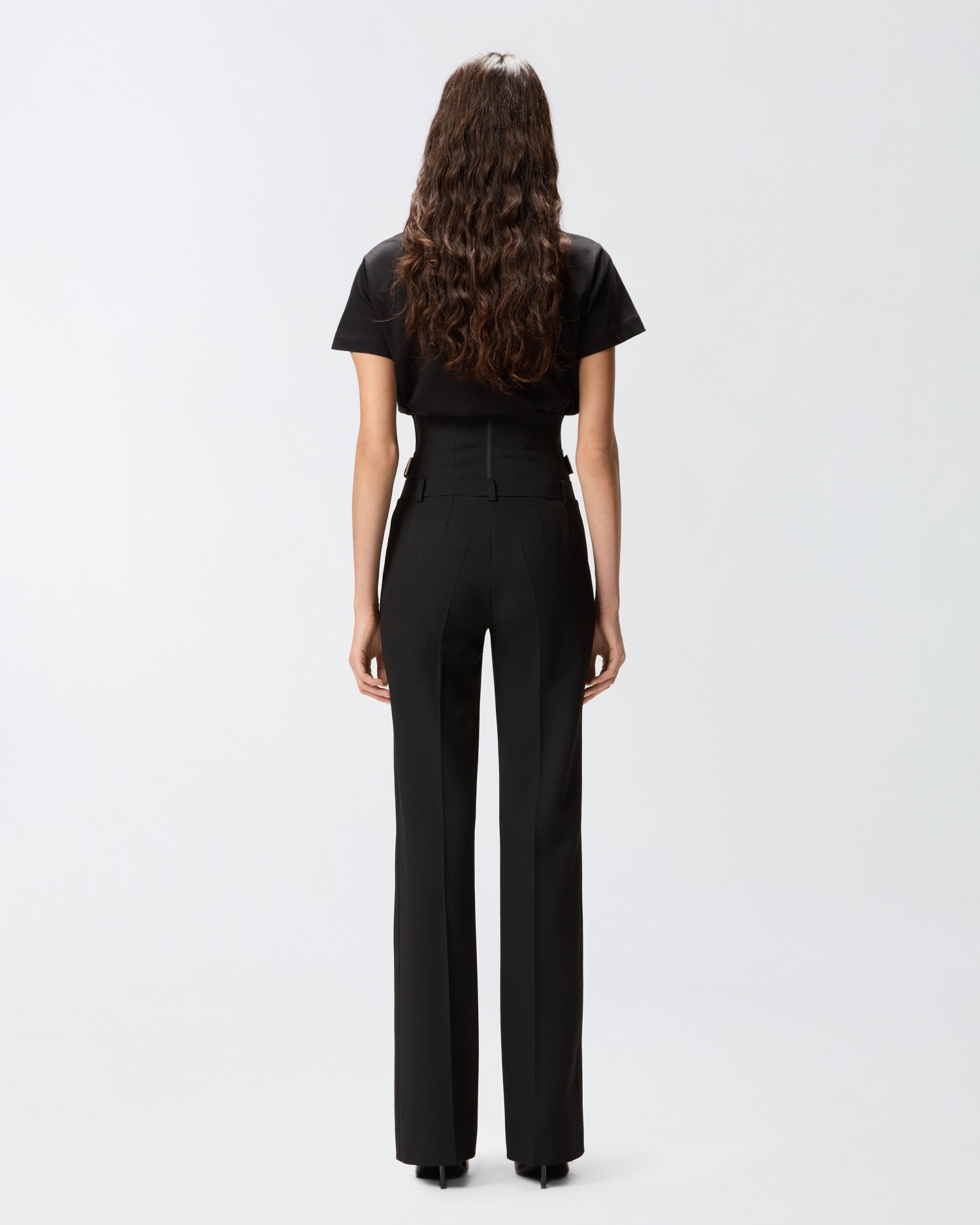 Spodnie o prostych nogawkach z bardzo wysokim stanem i fiszbinami nawiązującymi do kobiecych gorsetów. Krepa z poliwiskozy, podwójna, wyjątkowo uniwersalna i wysokowydajna tkanina elastyczna w dwóch kierunkach, została poddana wysokiej jakości zabiegom, które pozwalają na uzyskanie wyrafinowanego wyglądu wełny. Całości dopełniają szlufki na pasek, paski w talii, służące do regulacji dopasowania odpowiednio do twoich potrzeb oraz ukryte zapięcie z przodu. Wyważone połączenie męskiego i kobiecego stylu sprawi, że twoje najbardziej formalne stylizacje w nowym sezonie będą absolutnie wyjątkowe.