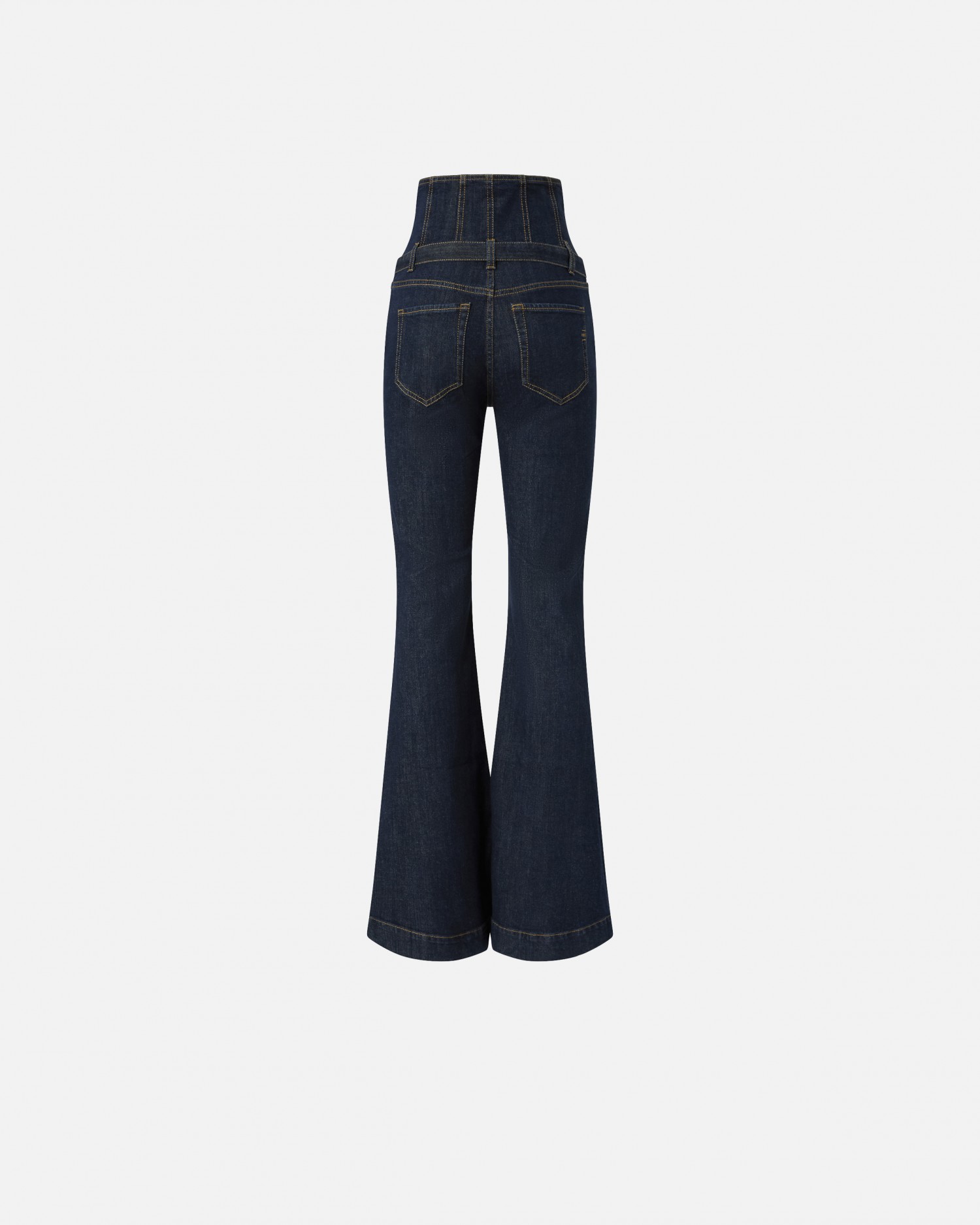 Dżinsy flare z pięcioma kieszeniami, z obcisłą nogawką do kolan i miękką i rozszerzaną u dołu, charakteryzują się bardzo wysokim stanem z przeszyciami przypominającymi fiszbiny damskich gorsetów. Model został uszyty z wygodnego dżinsu bawełnianego z delikatnym spraniem rinse blu. Aby spersonalizować projekt w czystym stylu PINKO, na prawej tylnej kieszeni zostało wyhaftowane logo. Całości dopełniają szlufki, pasek z metalową klamrą z logo oraz ukryte zapięcie z przodu. Wypróbuj total look z gorsetem od kompletu, aby stworzyć kobiecą i odważną stylizację.
