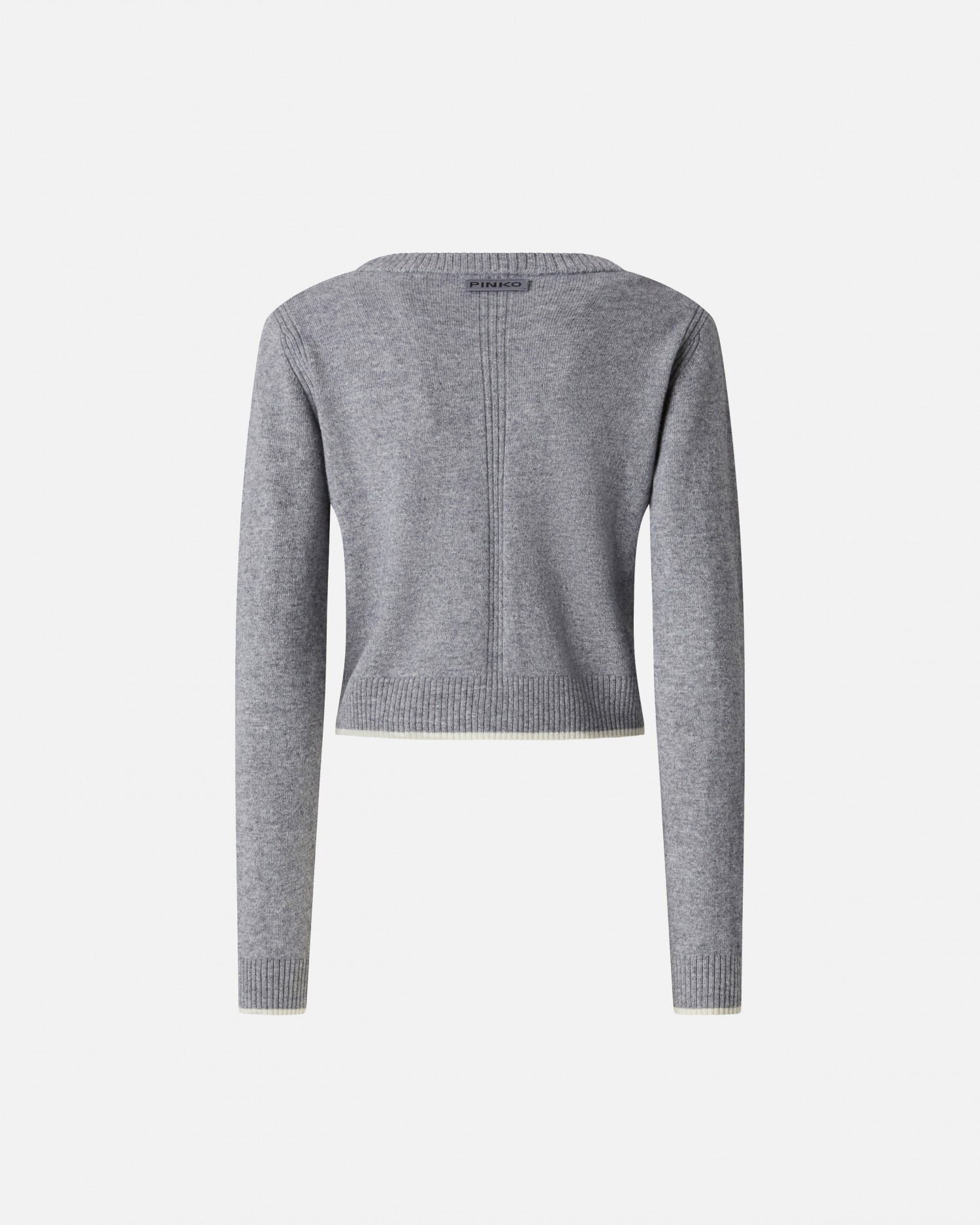 Kardigan wykonany z miękkiej mieszanki wełny merynosów i kaszmiru z dekoltem w serek, ściągaczem na obszyciu i mankietach. Kontrastująca przędza podkreśla mankiety i brzegi, a charakterystyczna metka z logo PINKO dopełnia całości. Odzież została poddana testom wykończeniowym, aby zminimalizować możliwość tworzenia się mechaceń i zapewnić większą miękkość i trwałość materiału. Minimalistyczny i nowoczesny projekt będzie ci towarzyszyć zawsze i wszędzie.