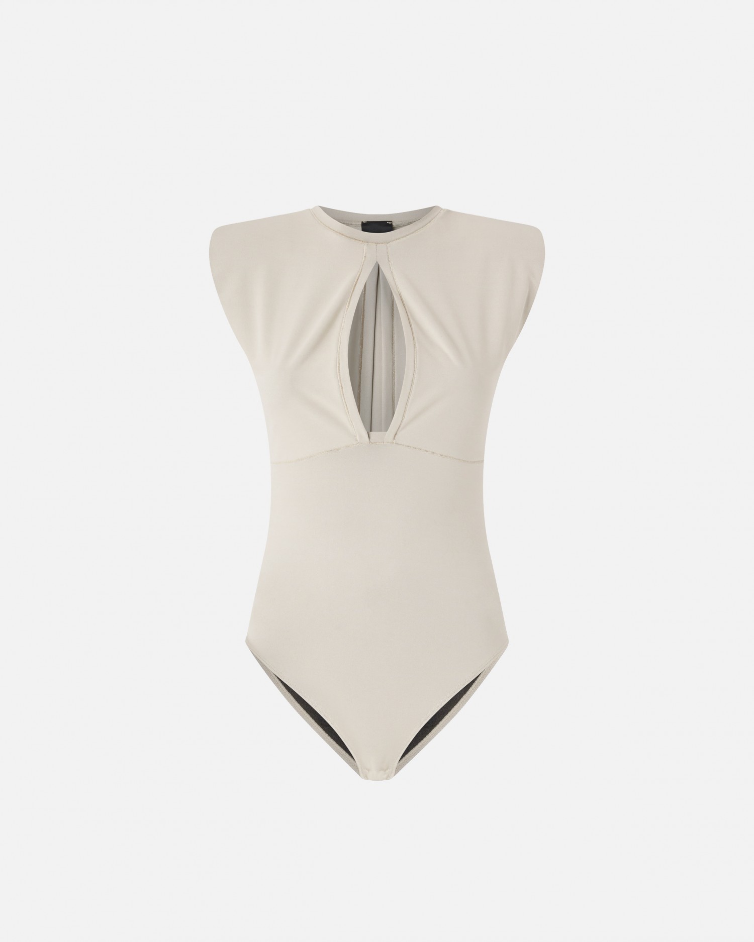 Body z rękawami motylkami, wykonane z nieprującej dzianiny, która zapewnia efekt drugiej skóry. Materiał jest podszyty kontrastową tkaniną, aby uzyskać inspirowany sportem techniczny wygląd. Jednocześnie mocne dopasowanie modelu sprawia, że jest on niezwykle kobiecy i zmysłowy, ale detalem, który przykuwa uwagę, jest wycięcie na piersi, tak proste, jak i efektowne.