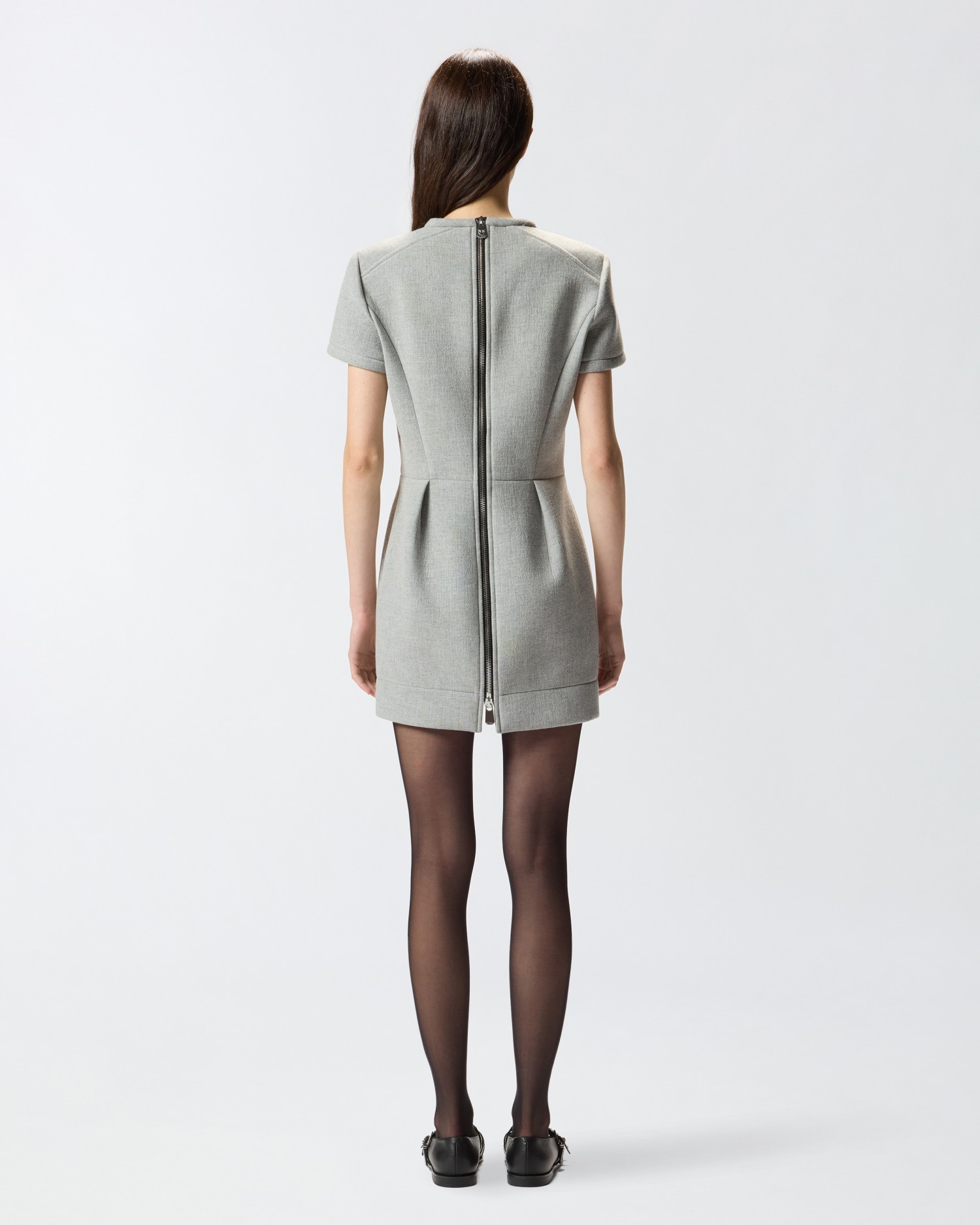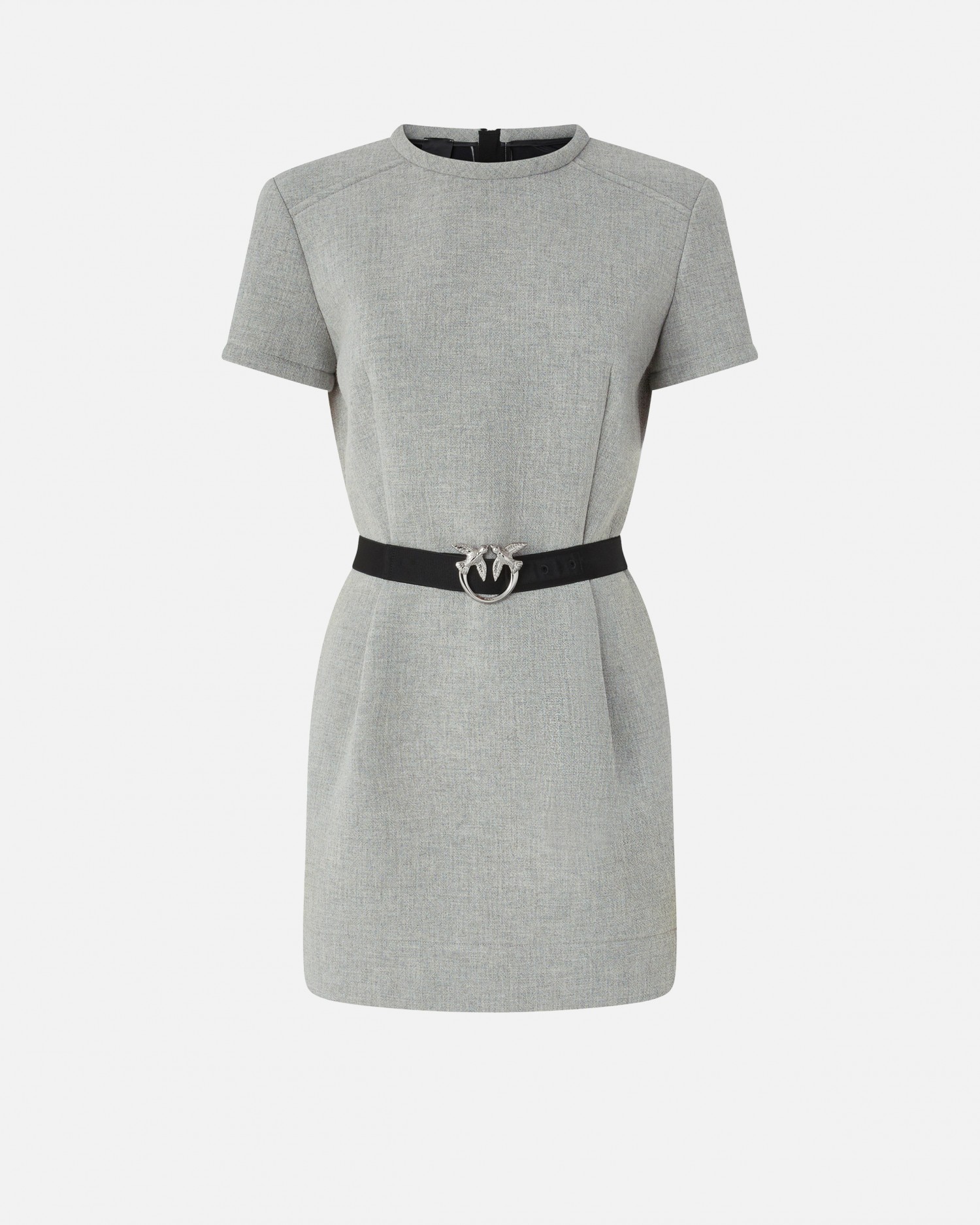 Sukienka z krótkim rękawem o dopasowanym fasonie, uszyta ze spranej i łączonej gazy wełnianej, ozdobiona z tyłu centralnym zapięciem na zamek z podwójnym suwakiem. Tkanina nadaje modelowi kompaktowego i nowoczesnego efektu, a wyraźnie zarysowana konstrukcja tworzy doskonałe proporcje do codziennych stylizacji. Ostateczny akcent stanowi otulający talię wyjmowany pasek, ozdobiony logo Love Birds, świadczącym o niepowtarzalnym stylu marki.