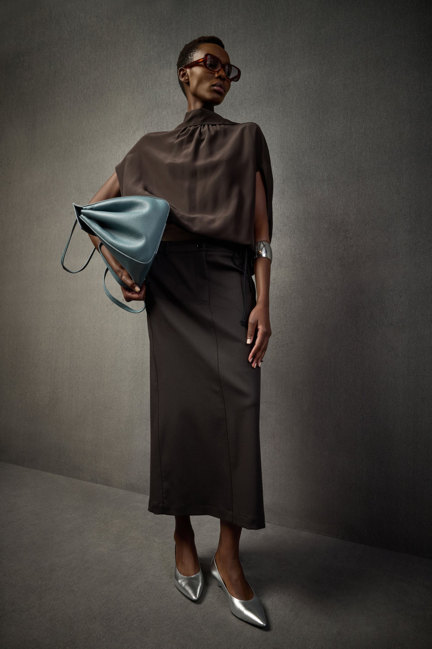LUŹNA BLUZKA WYKONANA W 100% Z JEDWABIU Z FALBANKĄ PRZEDŁUŻAJĄCĄ SIĘ Z TYŁU, ODKRYWAJĄCĄ TYŁ. OBNIŻONE RAMIONA I REGULOWANY DÓŁ ŚCIĄGANY SZNURKIEM.