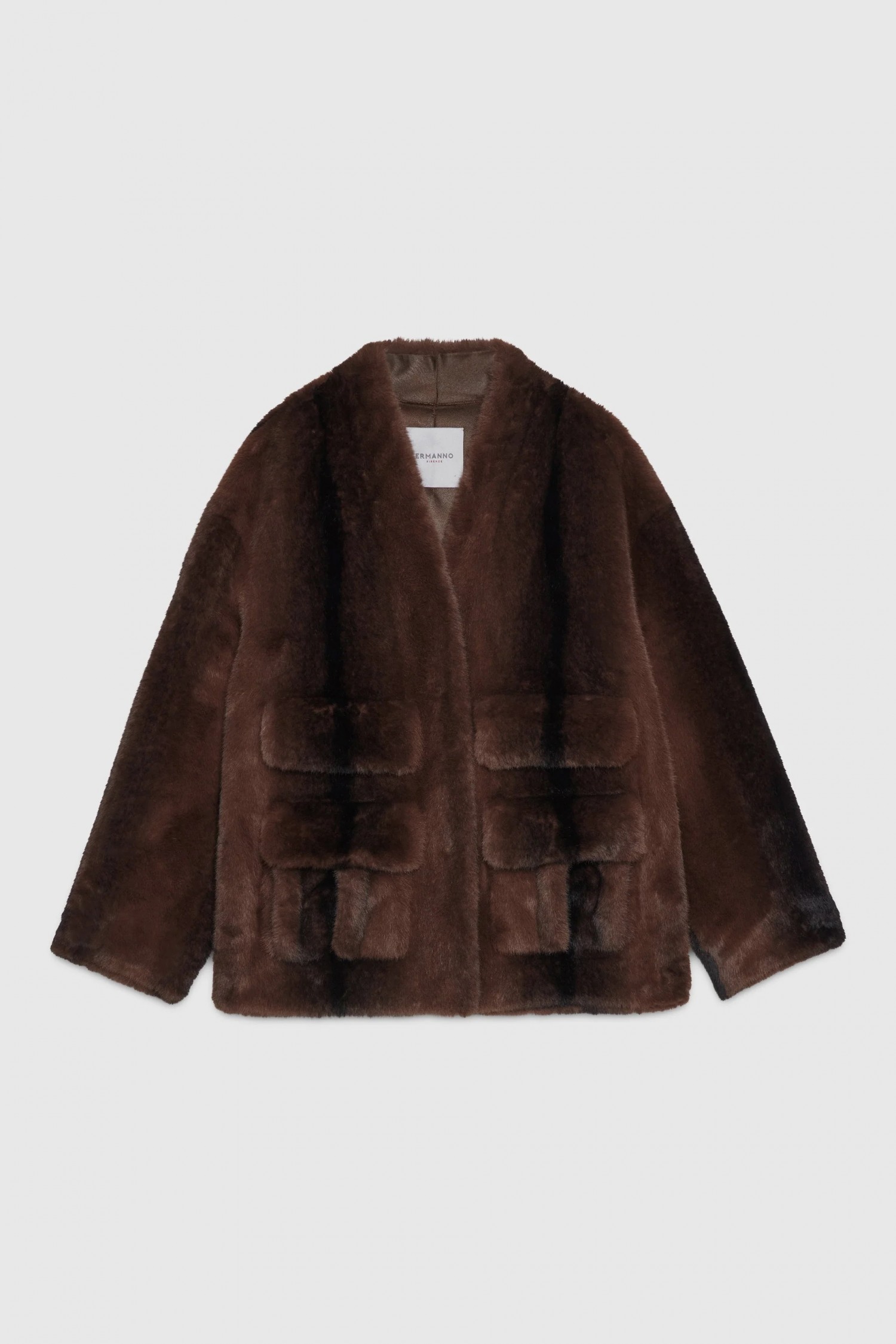 Kurtka ze sztucznego futra z norek w odcieniu brązu. Model z dekoltem w serek, dwiema kieszeniami naszytymi z przodu i miękką podszewką. Zapięcie na zatrzaski.