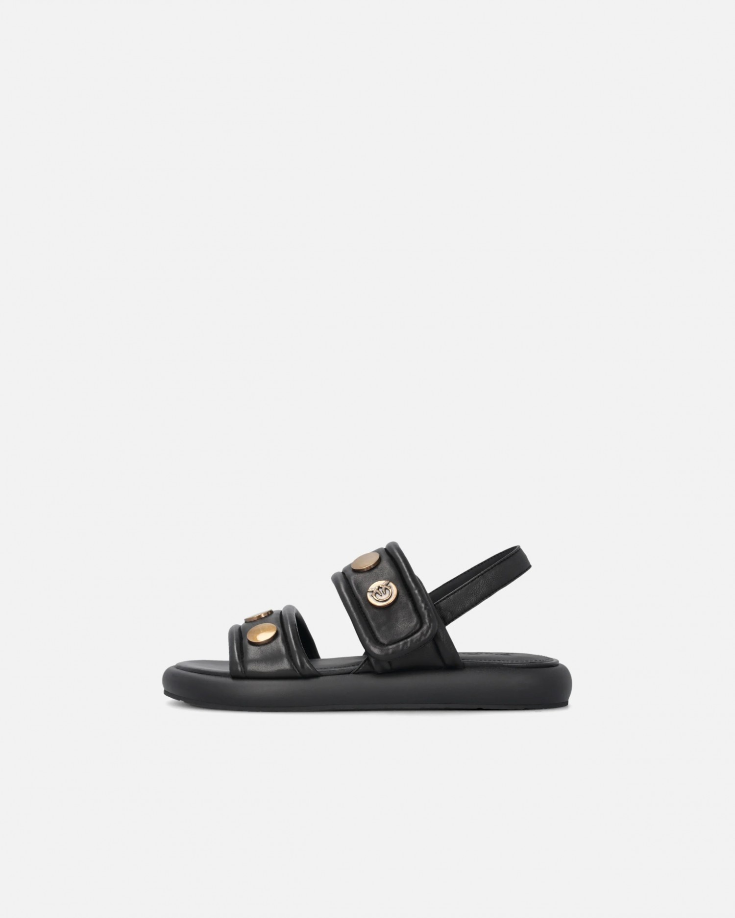 Niskie sandały z miękkiej skóry nappa z dwiema obszernymi wyściełanymi górnymi opaskami ozdobionymi okrągłymi i płaskimi metalowymi aplikacjami, z których jedna jest wykończona logo Love Birds. Model z ergonomiczną gumową podeszwą o grubym, ale harmonijnym profilu, ma skórzaną wkładkę, która sprawia, że noszenie jest jeszcze wygodniejsze, oraz pasek, który owija się wokół tylnej części stopy, aby zapewnić większą stabilność podczas chodzenia. Te miejskie i zdecydowane sandały staną się twoim najlepszym sprzymierzeńcem, który z determinacją i praktycznością sprawdzi się podczas twoich dni w mieście, również dzięki wygodnemu zapięciu na rzep przy jednej z górnych opasek. - FIONA 01