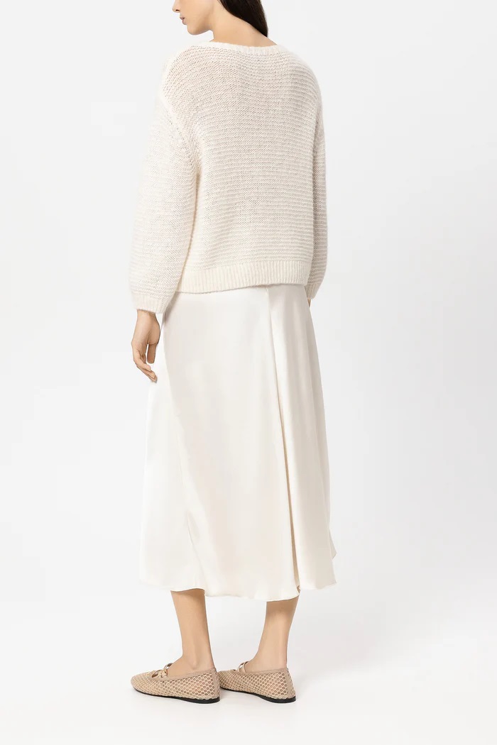 Długa, lekko ukośna satynowa spódnica ze sportowym zapięciem na guzik, haftkę i zamek błyskawiczny z przodu. U dołu laserowo wycięte szwy.