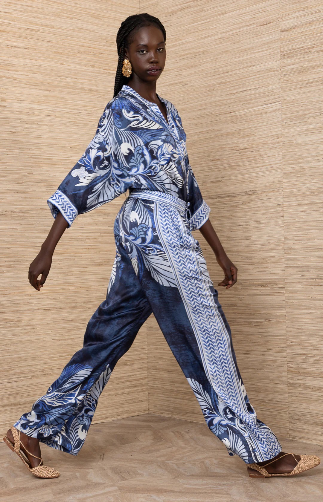Prany jedwab/wiskoza szarmeza Kieszenie na biodrach Gumka w pasie z wiązaniem z przodu Obszerne nogawki Długość całkowita (wewnętrzny szew 81 cm)